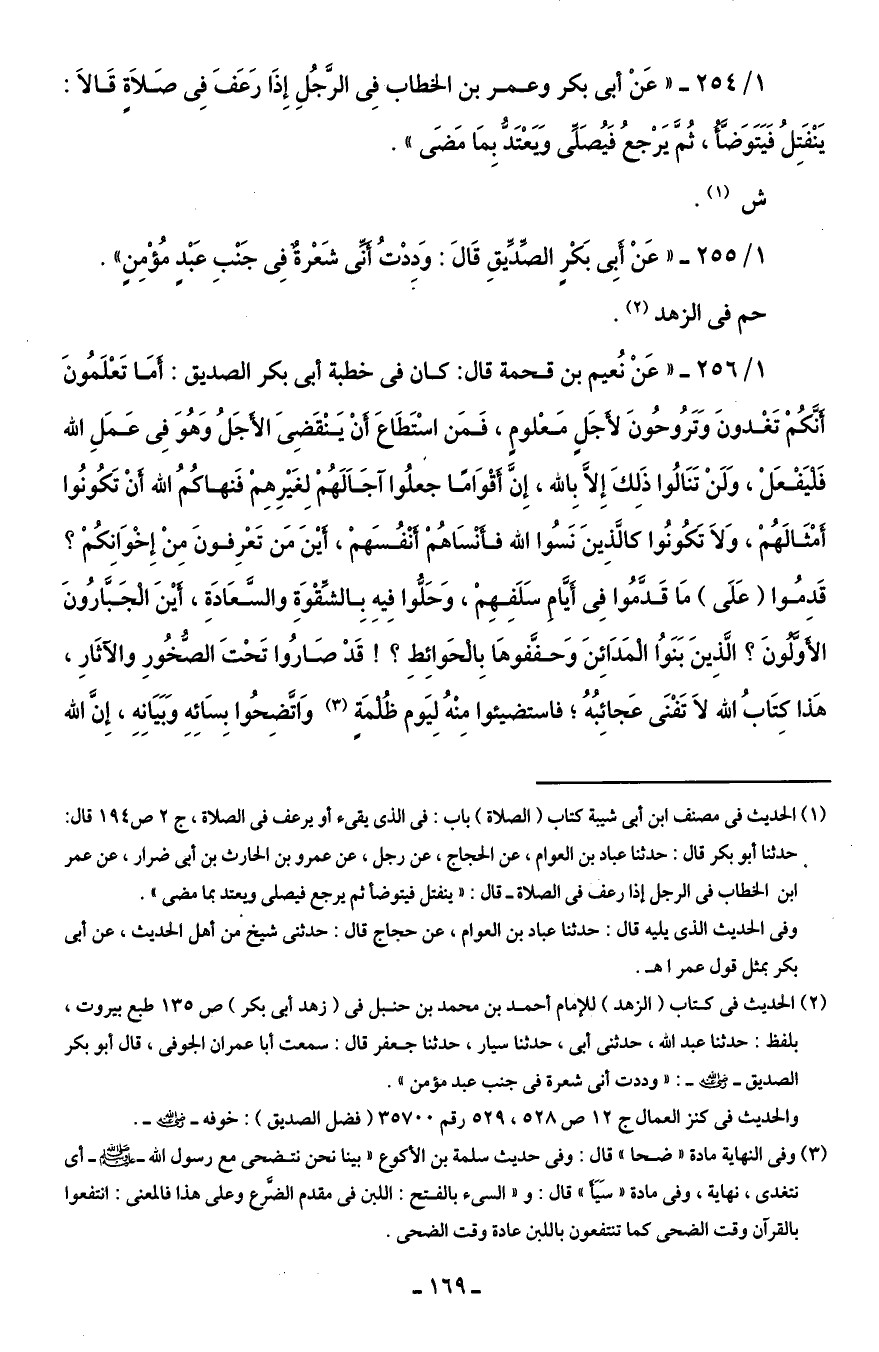 1/ 256 - "عَنْ نُعيم بن قحمة قال: كان في خطبة أبى بكر الصديق: أمَا تَعْلَمُونَ أَنَّكُمْ تَغْدونَ وَتَرُوحُونَ لأَجَلٍ مَعْلومٍ، فَمَن اسْتَطَاعَ أَنْ يَنْقَضِىَ الأَجَلُ وَهُوَ فِى عَمَلِ الله فَلْيَفْعَلْ، وَلَنْ تَنَالُوا ذَلِكَ إِلَّا بِالله، إِنَّ أَقْوَامًا جَعلُوا آجَالَهُمْ لِغَيْرِهِمْ فَنهاكُمُ الله أنْ تَكُونُوا أَمْثَالَهُمْ، وَلاَ تَكُونُوا كالَّذِينَ نَسُوا الله فأَنْسَاهُمْ أَنْفُسَهمْ، أَيْنَ مَن تَعْرِفونَ مِنْ إِخْوَانِكُمْ؟ قَدِمُوا (عَلَى) مَا قَدَّمُوا فِى أَيَّامِ سَلَفِهِمْ، وَحَلُّوا فِيهِ بِالشِّقْوَةِ والسَّعَادَةِ، أَيْنَ الْجَبَّارُونَ الأَوَّلُونَ؟ الَّذِينَ بَنَوُا الْمَدَائِنَ وَحفَّفوهَا بِالْحَوائِطِ؟ ! قَدْ صَارُوا تَحْتَ الصُّخُورِ والآثَارِ، هَذا كِتَابُ الله لَا تَفْنَى عَجائِبُهُ؛ فاستضيئوا مِنْهُ لِيَوم ظُلْمَةٍ (¬3) وَاتَّضِحُوا بِسَائِهِ وَبَيَانِهِ، إِنَّ الله