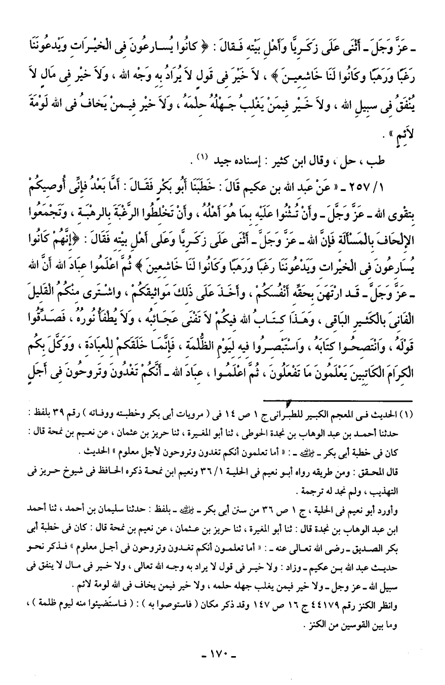 1/ 257 - "عَنْ عَبدِ الله بن عكيم قَالَ: خَطَبَنَا أَبُو بَكْرٍ فَقَالَ: أَمَّا بَعْدُ فإِنِّى أُوصِيكُمْ بِتقْوى الله - عَزَّ وَجَلَّ - وأَنْ تُثْنُوا عَلَيْهِ بمَا هُوَ أَهْلُهُ، وأَنْ تَخْلِطُوا الرَّغْبَةَ بِالرهْبَةِ، وَتَجمَعُوا الإِلْحَافَ بِالْمَسْأَلَةِ فَإنَّ الله - عَزَّ وَجَلَّ - أَثْنَى عَلَى زَكَرِيَّا وَعَلى أَهْلِ بيْتِهِ فَقَالَ: {إِنَّهُمْ كَانُوا يُسَارِعُونَ فِي الْخَيْرَاتِ وَيَدْعُونَنَا رَغَبًا وَرَهَبًا وَكَانُوا لَنَا خَاشِعِينَ} ثُمَّ اعْلَمُوا عِبَادَ الله أَنَّ الله - عَزَّ وَجَلَّ - قَد ارْتَهَنَ بِحَقِّهِ أَنْفُسَكُمْ، وأَخَذَ عَلَى ذَلِكَ مَواثِيقَكُمْ، واشْتَرى مِنْكُمُ الْقَلِيلَ الْفَانِىَ بالْكَثيرِ البَاقِى، وَهَذَا كِتَابُ الله فِيكُمْ لَا تَفْنَى عَجَائِبُه، وَلَا يُطْفَأُ نُورُهُ، فَصَدِّقُوا قَوْلَهُ، وَانْتَصِحُوا كِتَابَهُ، وَاسْتَبْصِرُوا فِيهِ لِيَوْمِ الظُّلْمَةِ، فَإِنَّمَا خَلَقَكمْ لِلْعِبَادَةِ، وَوَكَّلَ بِكُم الْكِرَامَ الْكَاتِبِينَ يَعْلَمُونَ مَا تَفْعَلُونَ، ثُمَّ اعْلَمُوا، عِبَادَ الله - أَنَّكُمْ تَغْدُونَ وتَروحُونَ فِى أَجَلٍ