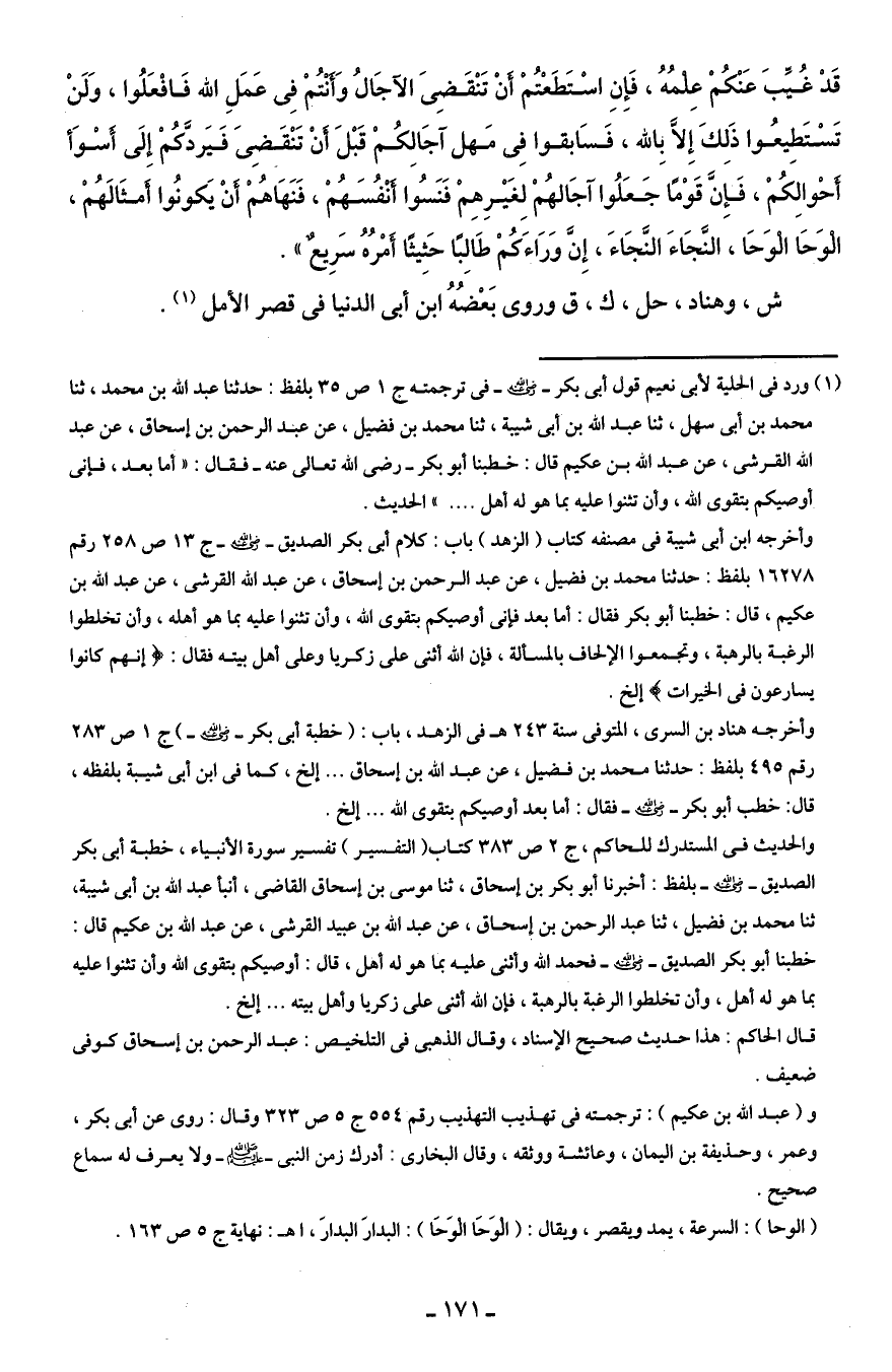 (¬1) ورد في الحلية لأبى نعيم قول أبى بكر - رضي الله عنه - في ترجمته ج 1 ص 35 بلفظ: حدثنا عبد الله بن محمد، ثنا محمد بن أبى سهل، ثنا عبد الله بن أبى شيبة، ثنا محمد بن فضيل، عن عبد الرحمن بن إسحاق، عن عبد الله القرشى، عن عبد الله بن عكيم قال: خطبنا أبو بكر - رضى الله تعالى عنه - فقال: "أما بعد، فإنى أوصيكم بتقوى الله، وأن تثنوا عليه بما هو له أهل .... " الحديث.