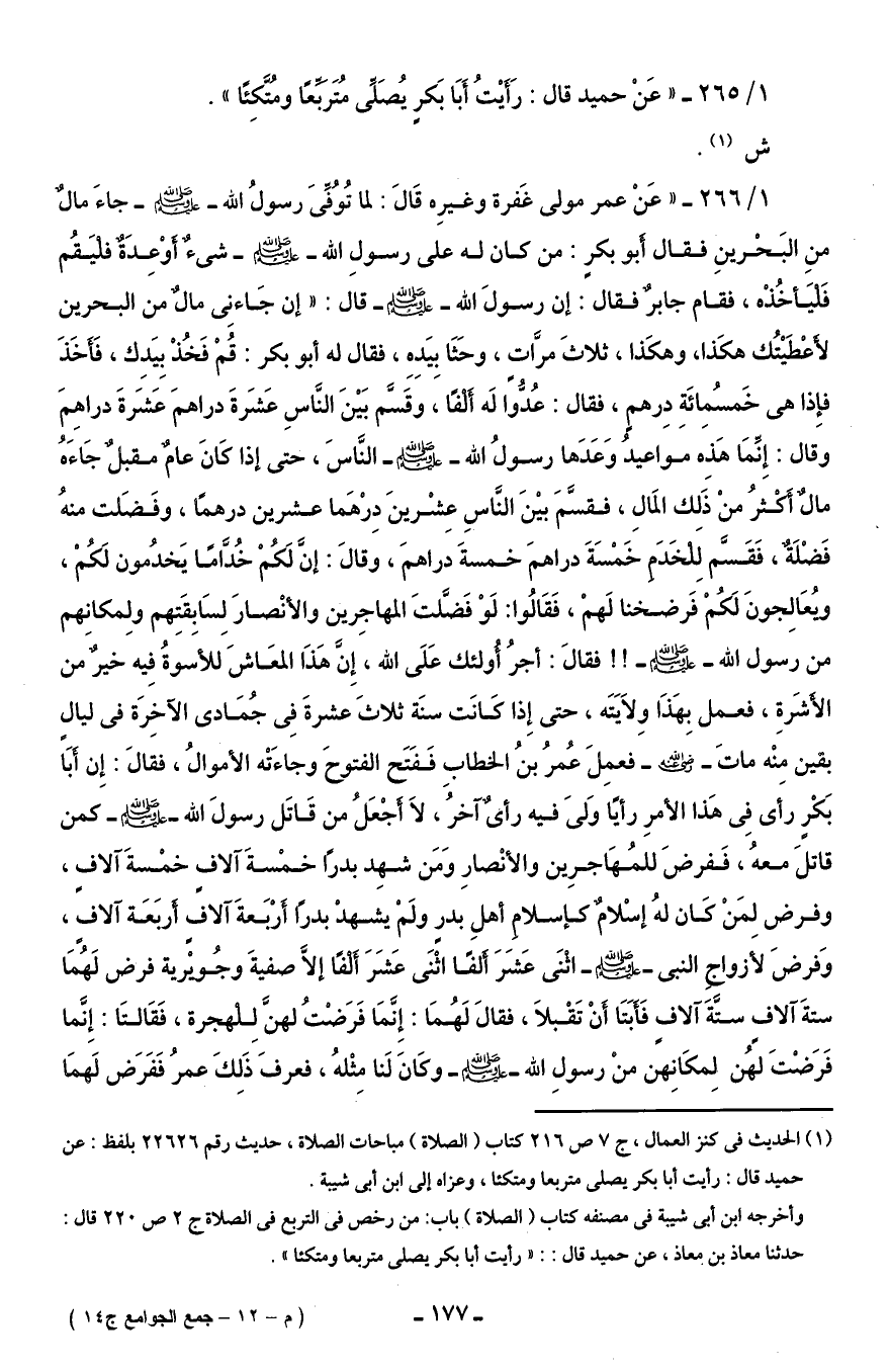 1/ 265 - "عَنْ حميد قال: رَأَيْتُ أَبَا بَكرٍ يُصَلِّى مُتَرَبِّعًا ومُتَّكِئًا".