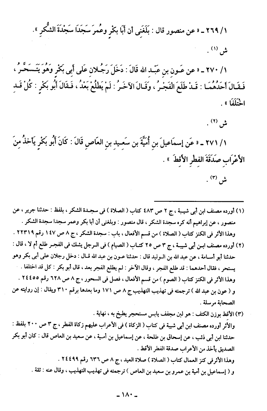 1/ 269 - "عن منصور قال: بَلَغَنِى أن أبَا بكْرٍ وعُمرَ سَجَدَا سَجْدَةَ الشُّكرِ".