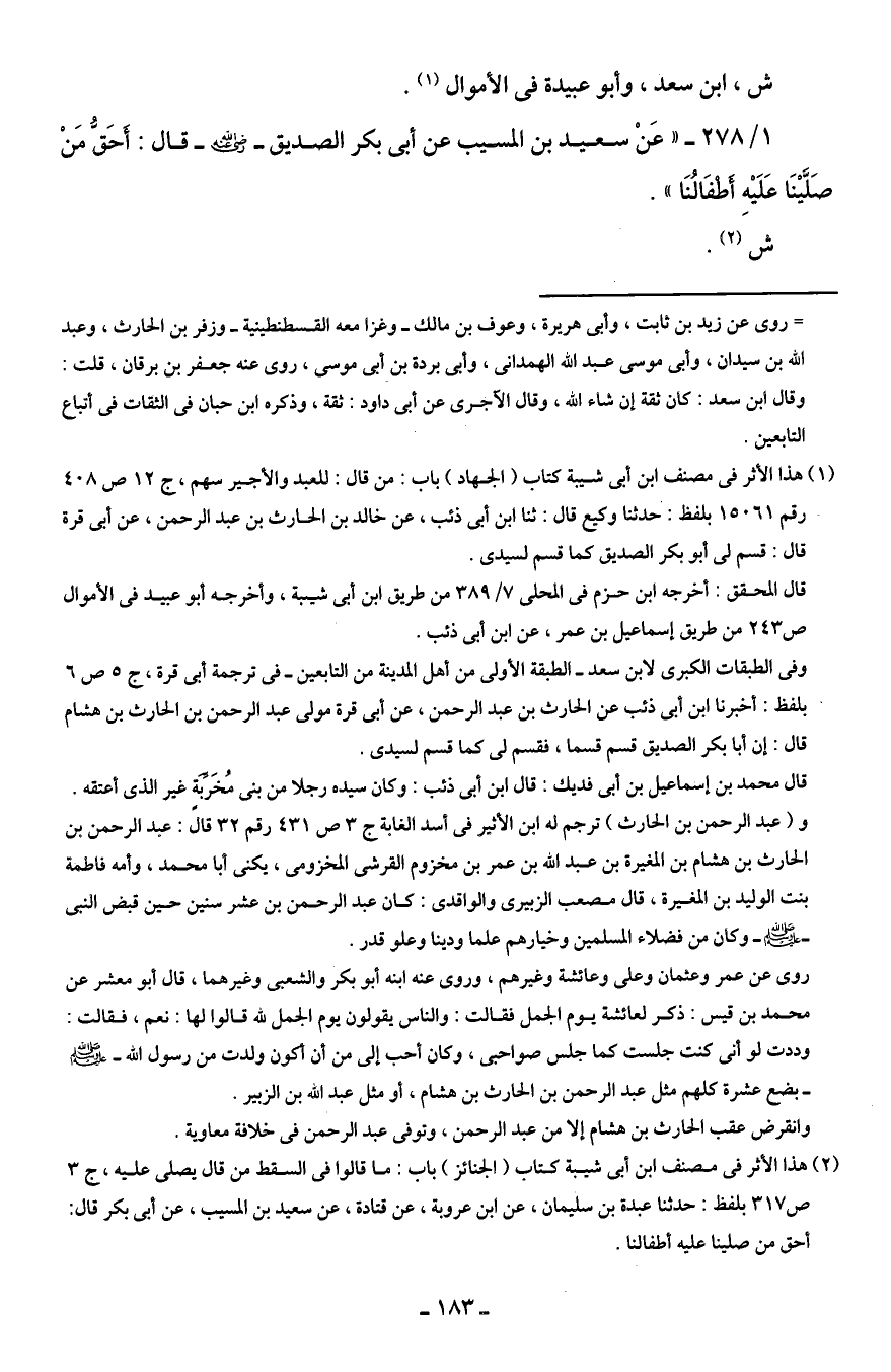 1/ 278 - "عَنْ سعيد بن المسيب عن أبى بكر الصديق - رضي الله عنه - قال: أَحَقُّ مَنْ صَلَّيْنَا عَلَيْهِ أَطْفَالُنَا".