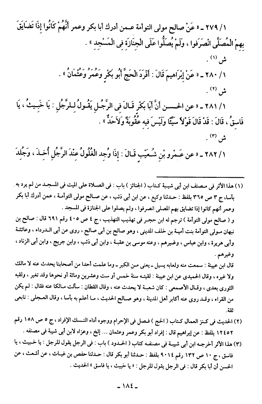 1/ 280 - "عَنْ إِبْرَاهيمَ قَالَ: أَفْرَدَ الْحَجَّ أَبُو بَكْرٍ وَعُمَرُ وَعُثْمَانُ".