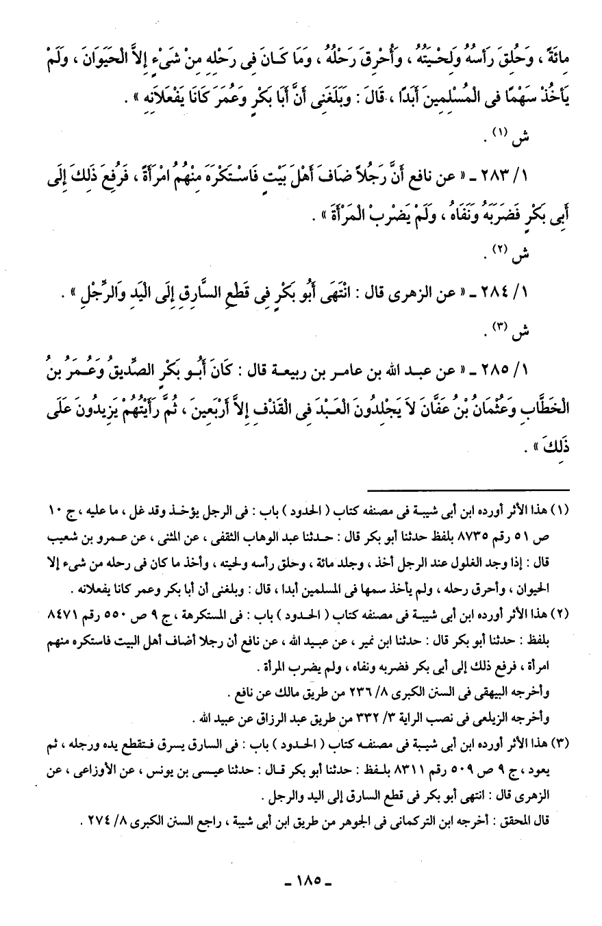 1/ 284 - "عن الزهرى قال: انْتَهَى أبُو بَكْرٍ فِى قَطْعِ السَّارِقِ إِلَى الْيَدِ وَالرِّجْلِ".