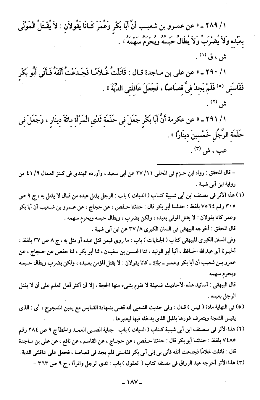1/ 289 - "عن عمرو بن شعيب أَنَّ أَبَا بَكْرٍ وَعُمَرَ كَانَا يَقُولَانِ: لَا يُقْتَلُ الْمَوْلَى بِعَبْدِهِ وَلَا يُضْرَبُ وَلَا يُطَالُ حَبْسُهُ ويُحْرَمُ سَهْمَهُ".