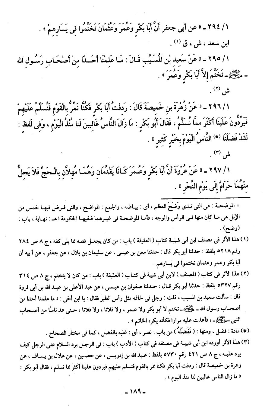 1/ 295 - "عَنْ سَعِيدِ بْن المُسَيِّبِ قَالَ: مَا عَلِمْنَا أَحَدًا مِنْ أَصْحَابِ رَسُولِ الله - صلى الله عليه وسلم - تَخَتَّمَ إِلَّا أَبَا بَكْرٍ وَعُمَرَ".