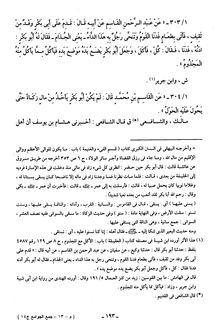 1/ 304 - "عَن الْقَاسِم بْنِ مُحَمَّدٍ قَالَ: لَمْ يَكُنْ أَبُو بَكرٍ يَأخُذُ مِنْ مالٍ زَكَاةً حَتَّى يَحُولَ عَلَيْهِ الْحَوْلُ".