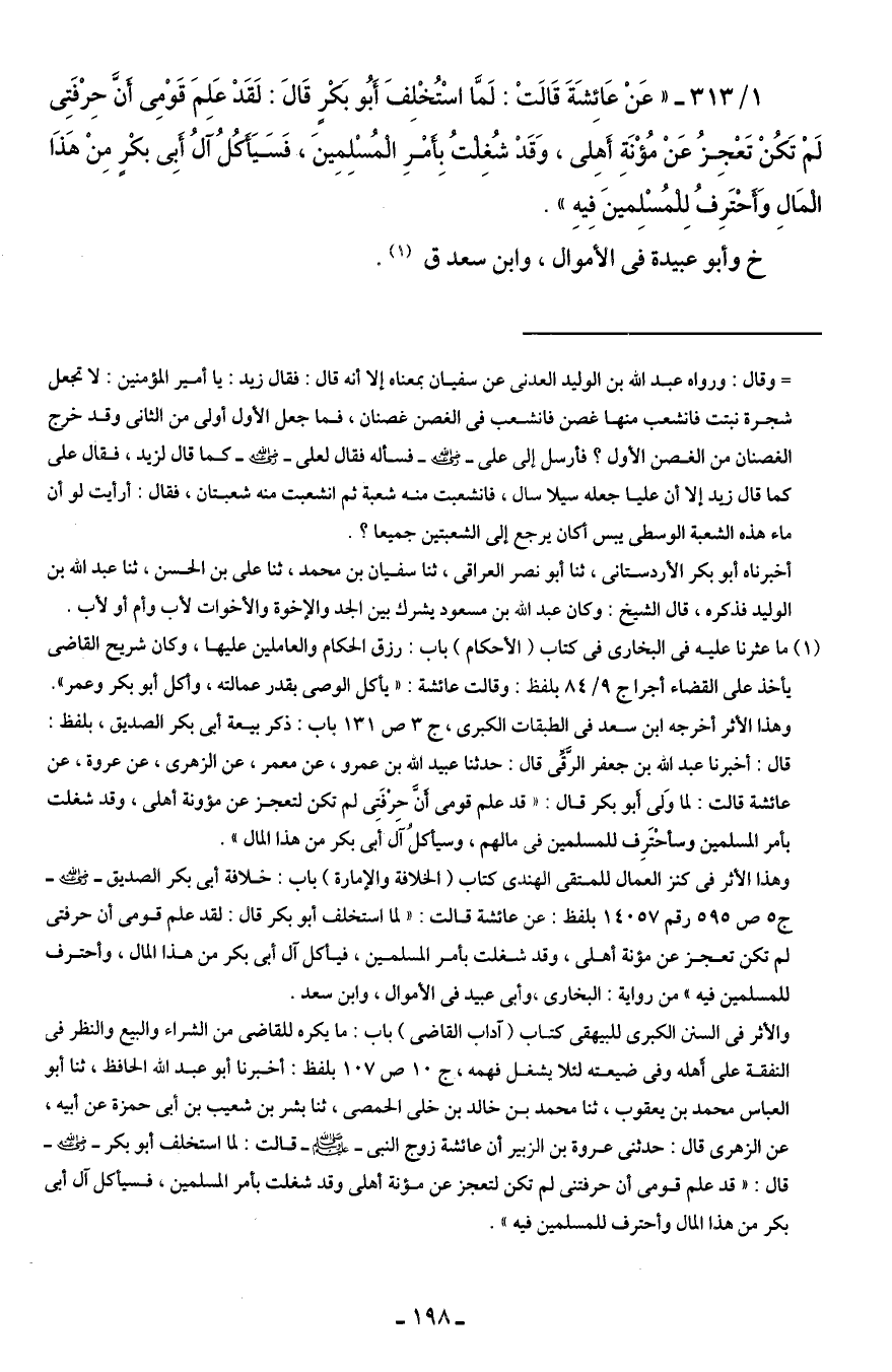 1/ 313 - "عَنْ عَائِشَةَ قَالَتْ: لَمَّا اسْتُخْلِفَ أَبُو بَكْرٍ قَالَ: لَقَدْ عَلِمَ قَوْمِى أَنَّ حِرْفَتِى لَمْ تَكُنْ تَعْجِزُ عَنْ مُؤْنَة أَهِلى، وَقَدْ شُغِلْتُ بِأَمْرِ الْمُسْلِمِينَ، فَسَيَأَكُلُ آلُ أَبِى بكْرٍ مِنْ هَذَا الْمَالِ وَأَحْتَرِفُ لِلْمُسْلِميَنَ فِيهِ".