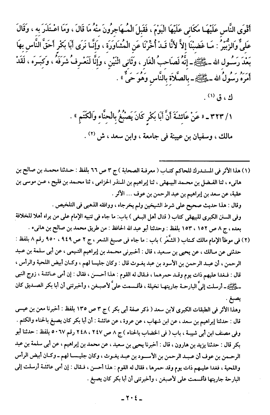 1/ 323 - "عَنْ عَائِشَةَ أَنَّ أَبَا بَكْرٍ كَانَ يَصْبُغُ بِالْحِنَّاءِ وَالْكَتَمِ".
