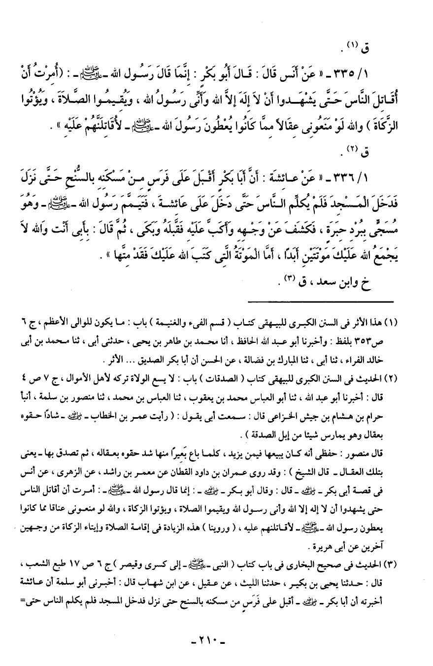 1/ 335 - "عَنْ أَنَس قَالَ: قَالَ أَبُو بَكْرٍ: إِنَّمَا قَالَ رَسُول الله - صلى الله عليه وسلم -: (أُمِرتُ أَنْ أُقَاتِلَ النَّاسَ حَتَّى يَشْهَدوا أَنْ لَا إِلَهَ إلَّا الله وَأنِّى رَسُولُ الله، وَيُقِيمُوا الصَّلَاةَ، وَيُؤْتُوا الزَّكَاةَ) والله لَوْ مَنَعُونِى عِقَالًا مِمَّا كَانُوا يُعْطُونَ رَسُولَ الله - صلى الله عليه وسلم - لأُقَاتِلَنَّهمْ عَلَيْهِ".