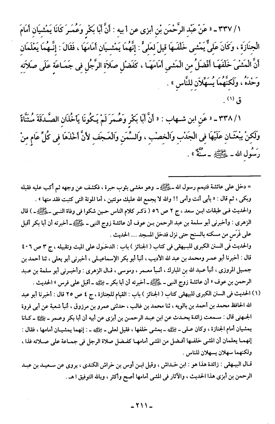 1/ 337 - "عَنْ عَبْدِ الرَّحْمَن بْنِ أبزى عن أبيهِ: أَنَّ أَبَا بَكْرٍ وَعُمَرَ كَانَا يَمْشِيَانِ أَمَامَ الْجِنَازَةِ، وَكَانَ عَلِىٌّ يَمْشِى خَلْفَهَا قِيلَ لِعَلِىٍّ: إِنَّهُمَا يَمْشِيَانِ أَمَامَهَا، فَقَالَ: إنَّهُمَا يَعْلَمَانِ أَنَّ الْمَشْىَ خَلْفَهَا أَفْضَلُ مِنْ الْمَشىِ أَمَامَهَا، كَفَضْلِ صَلَاةِ الرَّجُلِ فِى جَمَاعَةٍ عَلَى صَلَاتِهِ وَحْدَهُ، وَلَكِنَّهُمَا يُسَهِّلَانِ لِلنَّاسِ".