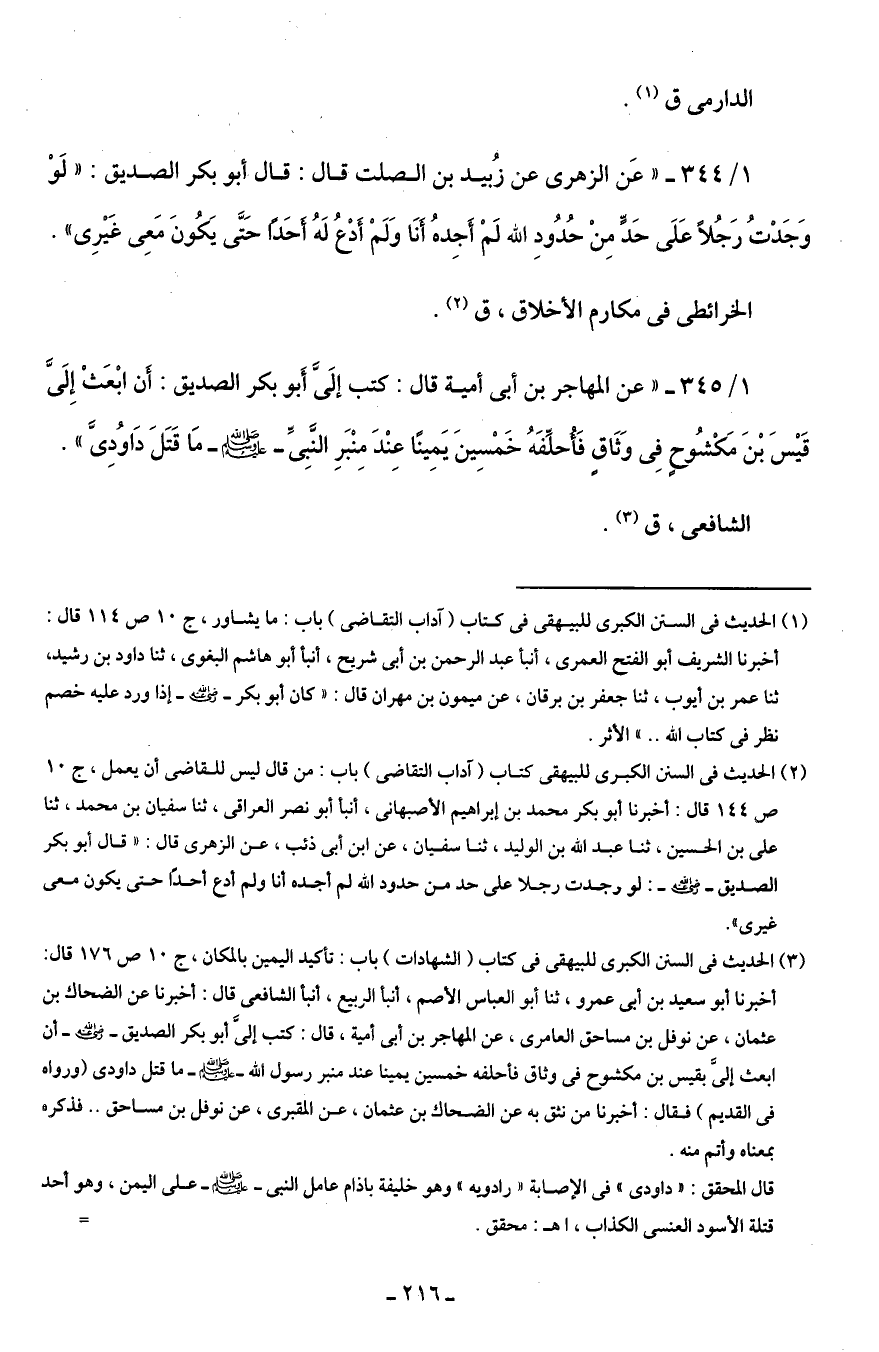 (¬3) الحديث في السنن الكبرى للبيهقى في كتاب (الشهادات) باب: تأكيد اليمين بالمكان، ج 10 ص 176 قال: أخبرنا أبو سيد بن أبى عمرو، ثنا أبو العباس الأصم، أنبأ الربيع، أنبأ الشافعى قال: أخبرنا عن الضحاك بن عثمان، عن نوفل بن مساحق العامرى، عن المهاجر بن أبى أمية، قال: كتب إلىَّ أبو بكر الصديق - رضي الله عنه - أن ابعث إلىَّ بقيس بن مكشوح في وثاق فأحلفه خمسين يمينا عند منبر رسول الله - صلى الله عليه وسلم - ما قتل داودى (ورواه في القديم) فقال: أخبرنا من نثق به عن الضحاك بن عثمان، عن المقبرى، عن نوفل بن مساحق .. فذكره بمعناه وأتم منه.