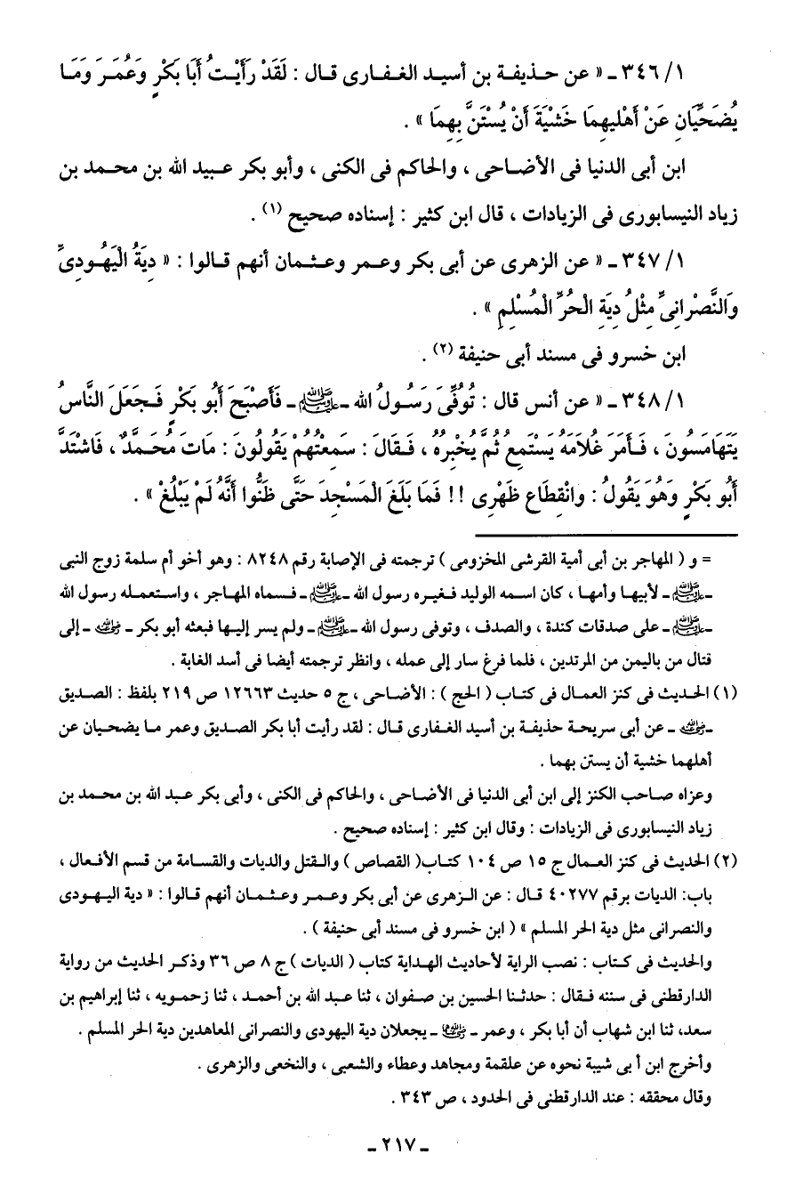 1/ 347 - "عن الزهرى عن أبى بكر وعمر وعثمان أنهم قالوا: "دِيَةُ الْيَهُودِىِّ وَالنَّصْرانِىِّ مِثْلُ دِيَةِ الْحُرِّ الْمُسْلِمِ".