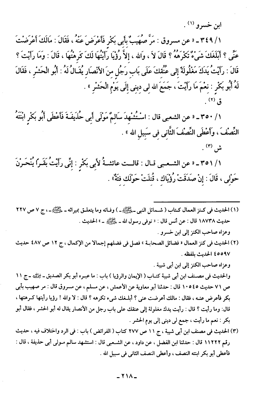 1/ 349 - "عن مسروق: مَرَّ صُهَيبٌ بِأَبِى بَكْرٍ فَأَعْرَضَ عَنْهُ، فَقَالَ: مَالَكَ أَعْرَضْتَ عَنِّى؟ أَبَلَغَكَ شَىْءٌ تَكْرَهُهُ؟ قَالَ لَا، وَالله، إِلَّا رُؤْيَا رَأَيْتُهَا لَكَ كَرِهْتُهَا، قَالَ: وَمَا رَأَيْتَ؟ قَالَ: رَأَيْتُ يَدَكَ مَغْلُولَةً إِلى عُنُقِكَ عَلَى بَابِ رَجُلٍ مِنَ الأَنْصَارِ يُقَالُ لَهُ: أَبُو الْحَشْرِ، فَقَالَ لَهُ أَبُو بَكْرٍ: نِعْمَ مَا رَأَيْتَ، جَمَعَ الله لِى دِينِى إِلَى يَوْمِ الْحَشْرِ".