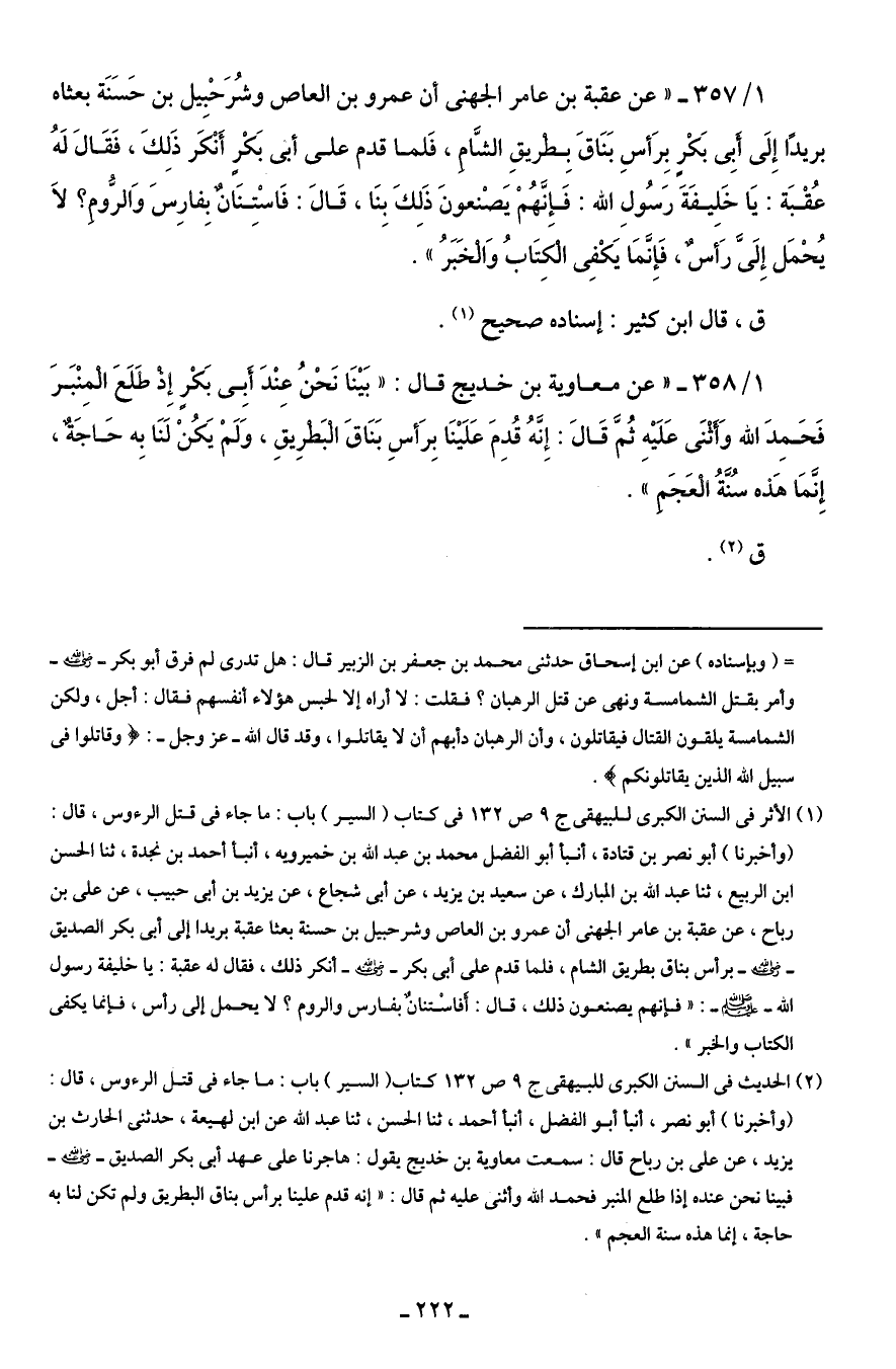 (¬1) الأثر في السنن الكبرى للبيهقى ج 9 ص 132 في كتاب (السير) باب: ما جاء في قتل الرءوس، قال: (وأخبرنا) أبو نصر بن قتادة، أنبأ أبو الفضل محمد بن عبد الله بن خميرويه، أنبأ أحمد بن نجدة، ثنا الحسن بن الربيع، ثنا عبد الله بن المبارك، عن سعيد بن يزيد، عن أبى شجاع، عن يزيد بن أبى حبيب، عن على بن رباح، عن عقبة بن عامر الجهنى أن عمرو بن العاص وشرحبيل بن حسنة بعثا عقبة بريدا إلى أبى بكر الصديق - رضي الله عنه - برأس بناق بطريق الشام، فلما قدم على أبى بكر - رضي الله عنه - أنكر ذلك، فقال له عقبة: يا خليفة رسول الله - صلى الله عليه وسلم -: "فإنهم يصنعون ذلك، قال: أَفاسْتنانٌ بفارس والروم؟ لا يحمل إلى رأس، فإنما يكفى الكتاب والخبر".