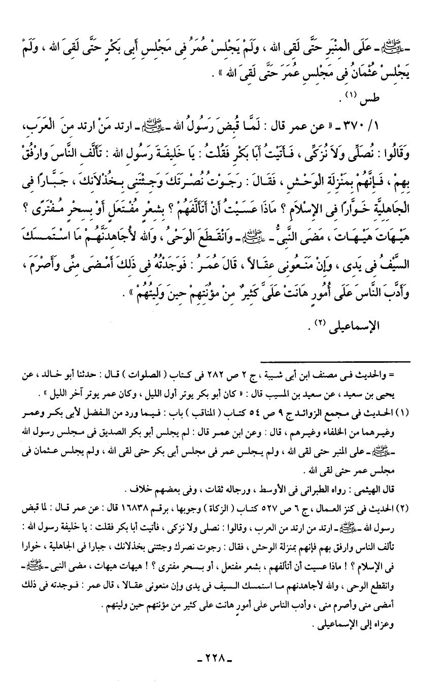 1/ 370 - "عن عمر قال: لَمَّا قُبِضَ رَسُولُ الله - صلى الله عليه وسلم - ارتد مَنْ ارتد مِنَ الْعَرَبِ، وَقَالُوا: نُصَلِّى وَلَا نُزَكِّى، فَأتَيْتُ أَبَا بَكْرِ فَقُلْتُ: يَا خَلِيفَةَ رَسُولِ الله: تَأَلَّفِ النَّاسَ وارْفُقْ بِهِمْ، فَإِنَّهُمْ بمَنْزِلَةِ الْوَحْشِ، فَقَالَ: رَجَوْتُ نُصْرَتَكَ وَجِئْتَنِى بِخُذْلَانِكَ، جَبَّارًا فِى الْجَاهِلِيَّةِ خَوَّارًا فِى الإِسْلَامِ؟ مَاذَا عَسَيْتُ أَنْ أَتَأَلَّفَهُمْ؟ بِشِعْرٍ مُفْتَعَلٍ أَوْ بِسِحْرٍ مُفْتَرًى؟ هَيْهَاتَ هَيْهَاتَ، مَضَى النَّبِىُّ - صلى الله عليه وسلم - وَانْقَطَعَ الْوَحْىُ، وَالله لأُجَاهِدَنَّهُمْ مَا اسْتَمسَكَ السَّيْفُ فِى يَدِى، وَإِنْ مَنَعُونِى عِقَالًا، قَالَ عُمَرُ: فَوَجَدْتُهُ فِى ذَلِكَ أَمْضَى مِنِّى وَأَصْرَمَ، وَأَدَّبَ النَّاسَ عَلَى اُمُورٍ هَانَتْ عَلَىَّ كَثِيرٌ مِنْ مؤُنَتِهِمْ حِينَ وَلِيتُهُمْ".