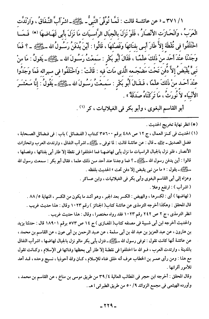 1/ 371 - "عن عائشة قالت: لَمَّا تُوُفِّىَ النَّبِىُّ - صلى الله عليه وسلم - اشْرَأَبَّ النِّفَاقُ، وَارتَدَّتِ الْعَرَبُ، وَانْحَازَت الأَنْصَارُ، فَلَوْ نَزَلَ بِالْجِبَالِ الرَّاسِيَاتِ مَا نَزَلَ بِأَبِى لَهَاضهَا (*) فَمَا اخْتَلَفُوا فِى نُقْطَةٍ إِلَّا طَارَ أَبِى بفنَائِهَا وَفَصْلِهَا، قَالُوا: أَيْنَ يُدْفَنُ رَسُولُ الله - صلى الله عليه وسلم -؟ فَمَا وَجَدْنَا عِنْدَ أَحَد مِنْ ذَلِكَ عِلْمًا، فَقَالَ أَبُو بَكْرٍ: سَمِعْتُ رَسُولَ الله - صلى الله عليه وسلم - يَقولُ: مَا مِنْ نَبِىٍّ يُقْبَضُ إِلَّا دُفِنَ تَحْتَ مَضْجَعِه الَّذِى مَاتَ فِيهِ: قَالَتْ: وَاخْتَلَفُوا فِى مِيراثِهِ فَمَا وَجَدُوا عنْدَ أَحَدٍ مِنْ ذَلِكَ عِلْمًا، فَقَالَ أَبَو بَكْرٍ: سَمِعْتُ رَسُولَ الله - صلى الله عليه وسلم - يَقولُ: إِنَّا مَعْشَرَ الأَنْبِيَاءِ لَا نُورَثُ، مَا تَرَكْنَاهُ صَدَقَةٌ".