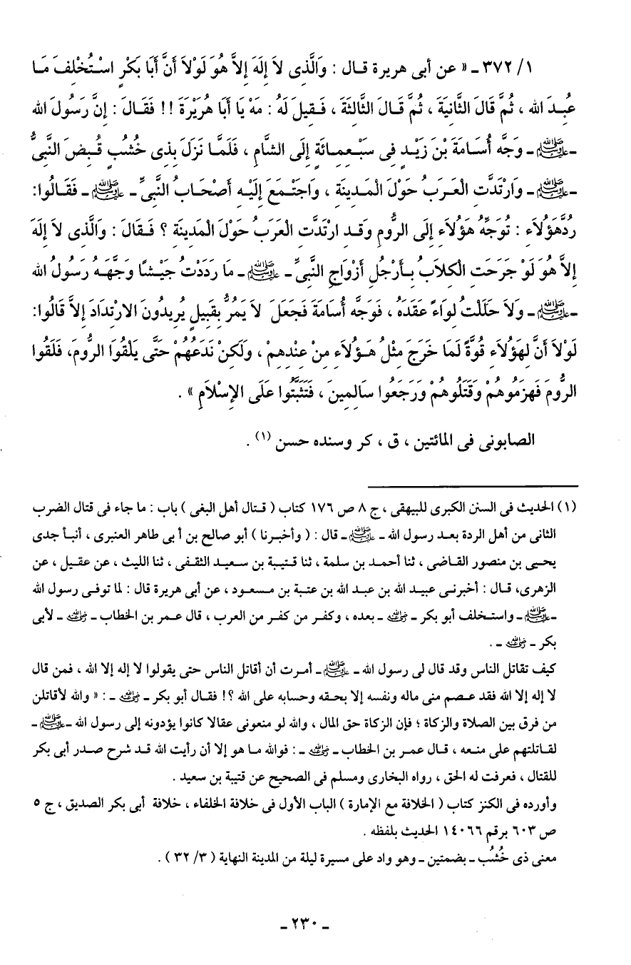 1/ 372 - "عن أبى هريرة قال: وَالَّذِى لَا إِلَهَ إِلَّا هُوَ لَوْلَا أَنَّ أبَا بَكْرٍ اسْتُخْلِفَ مَا عُبِدَ الله، ثُمَّ قَالَ الثَّانِيَةَ، ثُمَّ قَالَ الثَّالِثَةَ، فَقِيلَ لَهُ: مَهْ يَا أَبَا هُرَيْرَةَ! ! فَقَالَ: إِنَّ رَسولَ الله - صلى الله عليه وسلم - وَجَّه أُسَامَةَ بْنَ زَيدٍ فِى سَبْعِمِائَةٍ إِلَى الْشَّامِ، فَلمَّا نزَل، بِذِي خُشُبٍ قُبِضَ النَّبِىُّ - صلى الله عليه وسلم - وَارْتَدَّتِ الْعَرَبُ حَوْلَ الْمَدِينَةِ، وَاجَتْمَعَ إِلَيْهِ أصْحَابُ النَّبِىِّ - صلى الله عليه وسلم - فَقَالُوا: رُدَّ هَؤُلَاءِ: تُوَجِّهُ هَؤُلَاءِ إِلَى الرُّومِ وَقدِ ارْتَدَّتِ الْعَرَبُ حَوْلَ الْمَدِينَةِ؟ فَقَالَ: وَالَّذِى لَا إِلَهَ إِلَّا هُوَ لَوْ جَرَحَتِ الْكِلَابُ بِأَرْجُلِ ازْوَاج النَّبِىِّ - صلى الله عليه وسلم - مَا رَدَدْتُ جَيْشًا وَجَّهَهُ رَسُولُ الله - صلى الله عليه وسلم - وَلَا حَلَلْتُ لِوَاءً عَقَدَهُ، فَوَجَّه أُسَامَةَ فَجَعَلَ لَا يَمُرُّ بِقَبِيلٍ يُرِيدُونَ الارْتِدَادَ إِلَّا قَالُوا: لَوْلَا أَنَّ لِهَؤُلَاءِ قُوَّةً لَمَا خَرَجَ مِثْلُ هَؤُلَاءِ مِنْ عِنْدِهِمْ، وَلَكِنْ نَدَعُهُمْ حَتَّى يَلقُوَا الرُّومَ، فَلَقُوا الرُّومَ فَهزَمُوهُمْ وَقَتَلُوهُمْ وَرَجَعُوا سَالِمِينَ، فَتَثَبَّتُوا عَلَى الإِسْلَامِ".