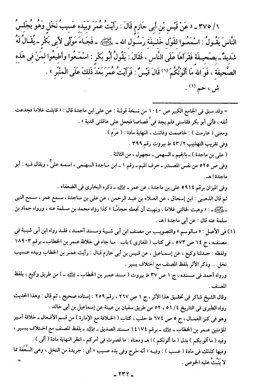 1/ 375 - "عَنْ قَيْسِ بْنِ أَبِى حَازِمٍ قَالَ: رَأَيْتُ عُمَرَ وَبِيَدِهِ عَسيبُ نَخْلٍ وَهُو يُجْلِسُ النَّاسَ يَقُولُ: اسْمَعُوا لِقَوْلِ خَليْفَةِ رَسُولِ الله - صلى الله عليه وسلم - فَجَاءَ مَوْلًى لأَبِى بَكْرٍ - يُقَالُ لَهُ شَدِيدٌ - بِصَحِيفَةٍ فَقَرَأهَا عَلَى النَّاسِ، فَقَالَ: يَقُولُ أَبُو بَكْرٍ: اسْمَعُوا وأَطيعُوا لِمَنْ فِى هَذِهِ الصَّحيفَةِ، فَوَالله مَا أَلَوْتُكُمْ (¬1) قَالْ قَيْسٌ: فَرَأَيْتُ عُمَرَ بَعْدَ ذَلكَ عَلى الْمِنْبَرِ".