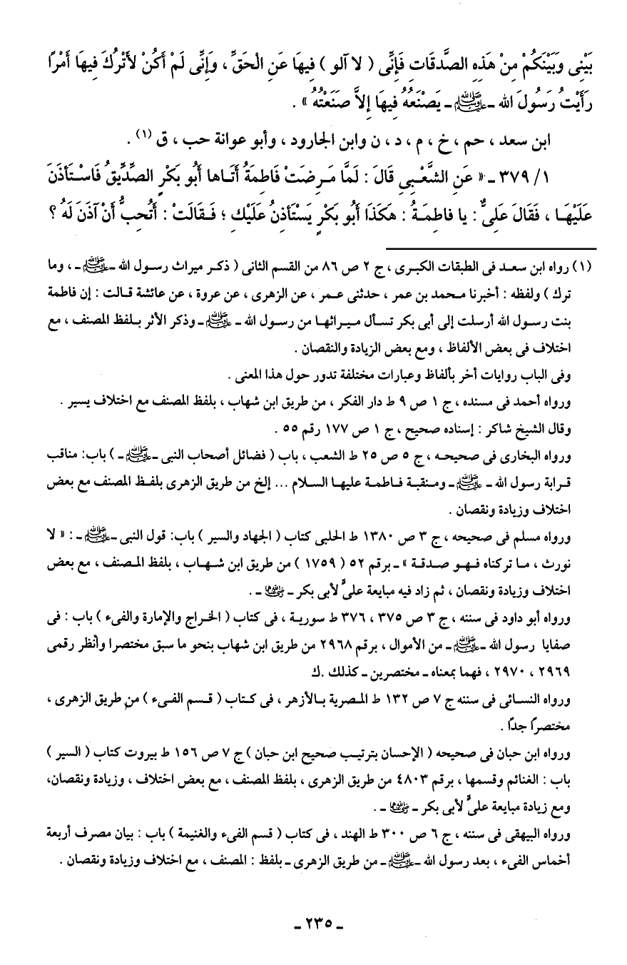 ورواه مسلم في صحيحه، ج 3 ص 1380 ط الحلبى كتاب (الجهاد والسير) باب: قول النبى - صلى الله عليه وسلم -: "لا نورث، ما تركناه فهو صدقة" - برقم 52 (1759) من طريق ابن شهاب، بلفظ المصنف، مع بعض اختلاف وزيادة ونقصان، ثم زاد فيه مبايعة علىٍّ لأبى بكر - رضي الله عنهما -.