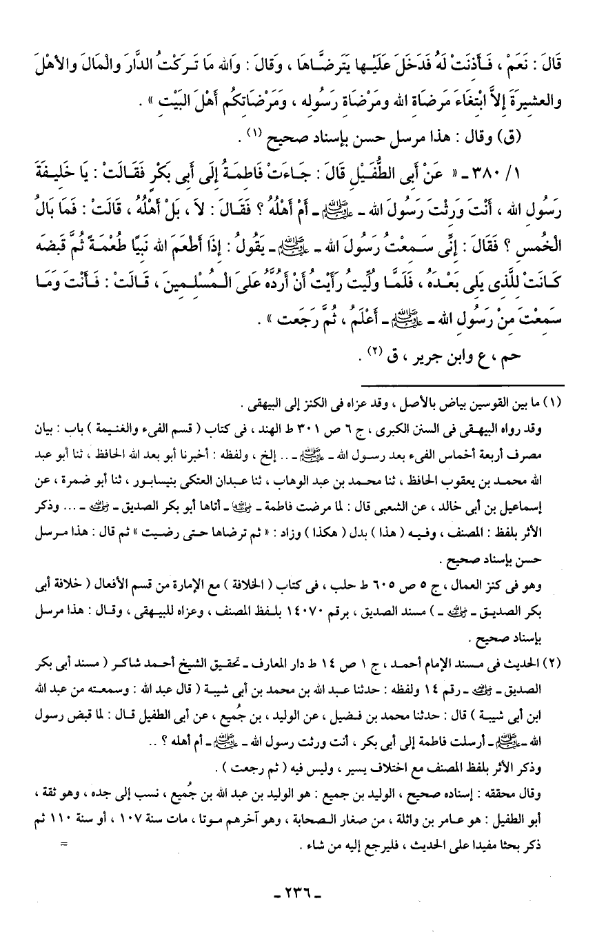 1/ 380 - "عَنْ أَبِى الطُّفَيْلِ قَالَ: جَاءَتْ فَاطِمَةُ إِلَى أَبِى بَكْرٍ فَقَالَتْ: يَا خَلِيفَةَ رَسُولِ الله، أَنْتَ وَرِثْتَ رَسُولَ الله - صلى الله عليه وسلم - أَمْ أَهْلُهُ؟ فَقَالَ: لَا، بَلْ أَهْلُهُ، قَالَتْ: فَمَا بَالُ الْخُمسِ؟ فَقَالَ: إِنِّى سَمِعْتُ رَسُولَ الله - صلى الله عليه وسلم - يَقولُ: إِذَا أَطعَمَ الله نَبِيًا طُعْمَةً ثُمَّ قَبضَه كَانَتْ لِلَّذِى يَلِى بَعْدَهُ، فَلَمَّا وُلِّيتُ رَأَيْتُ أَنْ أَرُدَّهُ عَلىَ الْمُسْلِمِينَ، قَالَت: فَأَنْتَ وَمَا سَمِعْتَ مِنْ رَسُولِ الله - صلى الله عليه وسلم - أَعْلَمُ، ثُمَّ رَجَعت".