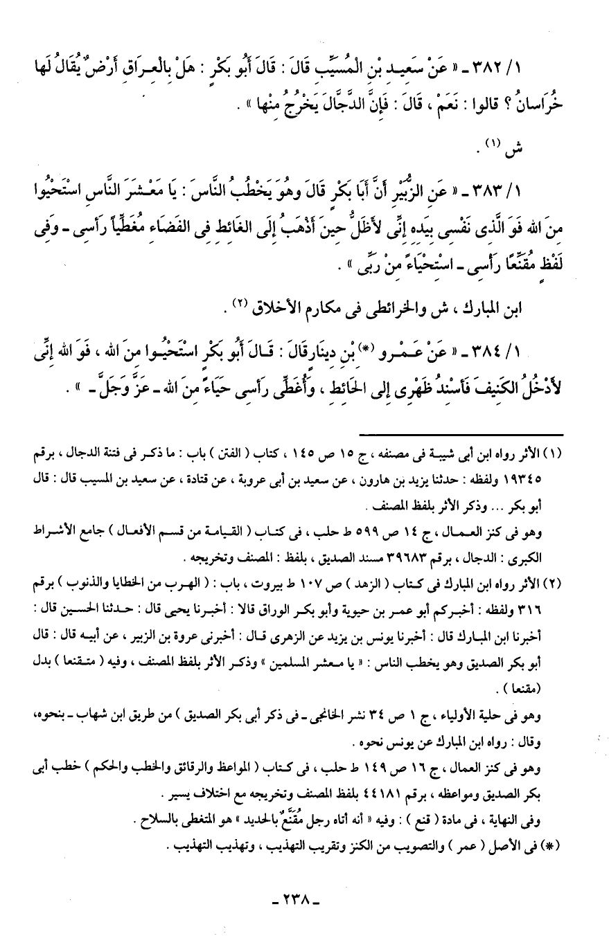 1/ 382 - "عَنْ سَعِيدِ بْنِ الْمُسيِّبِ قَالَ: قَالَ أَبُو بَكْرٍ: هَلْ بالْعِرَاقِ أَرْضٌ يُقَالُ لَها خُرَاسانُ؟ قالوا: نَعَمْ، قَالَ: فَإِنَّ الدَّجَّالَ يَخْرُجُ منْها".