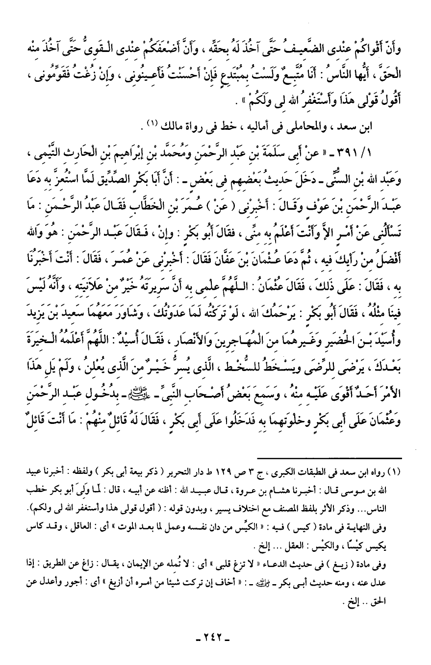 1/ 391 - "عنْ أبِى سَلَمَةَ بْنِ عَبْدِ الرَّحْمَنِ وَمُحَمَّد بْنِ إبْرَاهِيمَ بْنِ الْحَارِثِ التَّيْمِى، وَعَبْدِ الله بْنِ السُّنِّى - دَخَلَ حَدِيثُ بَعْضِهِمِ فِى بَعْضٍ -: أَنَّ أَبَا بَكْرٍ الصِّدِّيق لَما اسْتُعِزَّ بِهِ دَعَا عَبْدَ الرَّحْمَنِ بْنَ عَوْفٍ وَقَالَ: أَخْبِرْنِى (عَنْ) عُمَرَ بْنِ الْخَطَّابِ فَقَالَ عَبْدُ الرَّحْمَنِ: مَا تَسْأَلُنِى عَنْ أَمْرٍ إِلَّا وَأَنْتَ أَعْلَمُ بِهِ مِنِّى، فقَالَ أَبُو بَكْرٍ: وإِنْ، فَقَالَ عَبْد الرَّحْمَنِ: هُوَ وَالله أَفْضَلُ مِنْ رَأيِكَ فِيهِ، ثُمَّ دَعَا عُثْمَانَ بْنَ عَفَّانَ فَقَالَ: أَخْبِرْنِى عَنْ عُمَرَ، فَقَالَ: أَنْتَ أَخْبَرُنَا بِهِ، فَقَالَ: عَلَى ذَلِكَ، فَقَالَ عُثْمَانُ: اللَّهُمَّ عِلْمِى بِهِ أَنَّ سَرِيرَتَهُ خَيْرٌ مِنْ عَلَانِيَتِهِ، وَأَنَّهُ لَيْسَ فِينَا مِثْلُهُ، فَقَالَ أَبُو بَكْرٍ: يَرْحَمُكَ الله، لَوْ تَرَكْتُه لَمَا عَدَوْتُكَ، وَشَاوَرَ مَعَهُمَا سَعِيدَ بْنَ يَزِيدَ وأُسَيْدَ بْنَ الحُضَيرِ وَغَيرهُمَا مِنَ الْمُهَاجِرِينَ وَالأَنْصَارِ، فَقَالَ أُسيْدٌ: اللَّهُمَّ أَعْلَمُهُ الْخِيَرَةَ بَعْدَكَ، يَرْضَى لِلرِّضَى ويَسْخَطُ للسُّخْط، الَّذِى يُسِرُّ خَيْرٌ مِنَ الَّذِى يُعْلِنُ، وَلَمْ يَلِ هَذَا الأَمْرَ أَحَدٌ أَقْوَى عَلَيْهِ مِنْهُ، وَسَمِعَ بَعْضُ أَصْحَابِ النَّبِىِّ - صلى الله عليه وسلم - بِدُخُولِ عَبْدِ الرَّحْمَنِ وَعُثْمَانَ عَلَى أَبِى بَكْرٍ وخلْوَتهِمَا بِهِ فَدَخَلُوا عَلَى أَبِىْ بَكْرٍ، فَقَالَ لَه قَائِلٌ مِنْهُمْ: مَا أَنْتَ قَائِلٌ