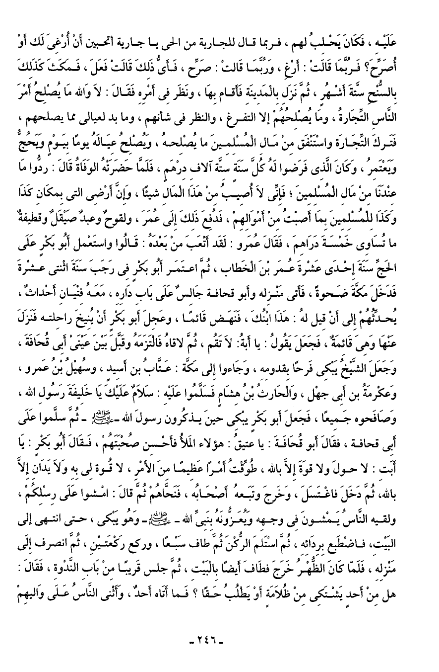 عَلَيْهِ، فَكَانَ يَحْلِبُ لهم، فربما قال للجارية من الحى يا جارية أتحبين أَنْ أُرْغِىَ لَك أَوْ أُصَرِّحَ؟ فَرُبَّمَا قَالَتْ: أَرْغِ، وَرُبَّمَا قَالتْ: صَرِّح، فَأَىُّ ذَلِكَ قَالَتْ فَعَلَ، فَمَكَثَ كَذَلِكَ بِالسُّنْحِ سَّتةَ أَشْهُرٍ، ثُمَّ نَزَل بِالْمَدِينَةِ فَأَقام بِهَا، ونَظَر فِى أَمْرِهِ فَقَالَ: لَا وَالله مَا يُصْلِحُ أَمْرَ النَّاسِ التَّجَارةُ، ومَا يُصْلِحُهُمْ إلا التفرغ، والنظر في شأنهم، وما بد لعيالى مما يصلحهم، فَتَركَ التِّجَارَة واسْتَنْفَق مِنْ مَالِ الْمُسْلِمِينَ ما يُصْلِحهُ، وَيُصْلِحُ عِيَالَهُ يومًا بِيَوْمٍ وَيَحُجُّ وَيَعْتَمِرُ، وَكَانَ الَّذى فَرَضوا لَهُ كُلَّ سَنَةٍ سِتَّة آلافِ دِرْهَمٍ، فَلَمَّا حَضَرَتْهُ الوَفَاةُ قَالَ: ردُّوا مَا عِنْدَنَا مِنْ مَال الْمُسلِمِينَ؛ فَإِنَّى لَا أُصِيبُ مِنْ هَذَا الْمَالِ شيئًا، وَإِنَّ أَرْضِى التى بِمكَانِ كَذَا وَكَذَا لِلْمُسْلِمِينَ بِمَا أَصبْتُ مِنْ أَمْوَالِهِمْ، فَدُفِعَ ذَلِكَ إِلَى عُمَرَ، ولقوحٌ وعبدٌ صَيْقَلٌ وقطيفةٌ ما تُسَاوِى خَمْسَةَ دَرَاهِمَ، فَقَالَ عُمَرو: لَقَد أَتْعَبَ منْ بَعْدَهُ: قَالُوا واستَعْمل أَبُو بَكْرٍ عَلَى الحَجِّ سَنَةَ إِحْدَى عَشْرةَ عُمَر بْنَ الْخَطاب، ثُمَّ اعتَمَر أَبُو بَكْرٍ فِى رَجَبَ سَنَةَ اثْنتى عشْرةَ فَدَخَلَ مَكَّةَ ضَحوةً، فَأَتى مَنْزِله وأَبو قحافة جَالِسٌ عَلَى بَاب دَارِهِ، مَعَهُ فِتْيَانِ أَحْداثٌ، يُحدِّثُهُمْ إِلى أَنْ قِيل لهُ: هَذَا ابْنكَ، فَنَهَض قَائمًا، وعَجِلَ أَبو بَكْرٍ أَنْ يُنِيخَ راحِلته فَنَزَلَ عَنْهَا وَهِىَ قَائِمَةٌ، فَجَعَلَ يَقُولُ: يا أَبةُ: لَا تَقُم، ثُمَّ لاقاهُ فَالْتَزَمَهُ وقَبَّلَ بَيْنَ عَيْنَىْ أَبِى قُحَافَةَ، وَجَعَلَ الشَّيْخُ يَبْكِى فَرحًا بقدومِهِ، وَجَاءوا إِلى مَكَّة: عَتَّابُ بن أَسِيدٍ، وسُهيْلُ بْنُ عَمرو، وَعكْرمَةُ بن أَبِى جهْل، وَالْحَارثُ بْنُ هِشَامٍ فَسَلَّمُوا عَلَيْهِ: سَلَامٌ عَلَيْكَ يَا خَلِيفَةَ رَسُولِ الله، وَصَافَحوه جَمِيعًا، فَجَعلَ أَبو بَكْرٍ يبْكِى حينَ يذكُرون رسولَ الله - صلى الله عليه وسلم - ثُمَّ سلَّموا عَلَى أَبِى قحافة، فقَالَ أَبو قُحَافَةَ: يا عتيقُ: هؤلاء المَلأُ فأَحْسِن صُحْبَتَهُمْ، فَقَالَ أَبُو بَكْرٍ: يَا أَبَتِ: لا حولَ ولا قوَةَ إِلَّا بالله، طُوِّقْتُ أَمْرًا عَظِيمًا مِنَ الأَمْرِ، لا قُوة لِى بِهِ وَلَا يَدَانِ إِلَّا بالله، ثُمَّ دَخَلَ فاغْتَسَلَ، وَخَرجَ وتَبَعهُ أَصْحَابُه، فَنَحَّاهُمْ ثُمَّ قالَ: امْشوا عَلَى رِسْلِكُمْ، ولقيه النَّاسُ يَمْشونَ فِي وجهِه وَيُعَزُّونَهُ بِنَبِىِّ الله - صلى الله عليه وسلم - وَهُو يَبْكى، حتى انتهى إلى البَيْتِ، فاضْطَبع بِرِدَائِهِ، ثُمَّ اسْتَلمَ الرُّكْنَ ثُمَّ طاف سَبْعًا، وركع رَكْعَتيْنِ، ثُمَّ انصرف إِلَى مَنْزلِهِ، فَلَمّا كَانَ الظُّهْرُ خَرَجَ فطَافَ أَيضًا بِالْبَيْتِ، ثُمَّ جلس قَريبًا مِنْ بَابِ النَّدْوةِ، فَقَالَ: هل مِنْ أَحدٍ يَشْتَكِى مِن ظُلَامَةٍ أَوْ يَطْلُبُ حَقًا؟ فَما أَتَاه أَحدٌ، وَأَثْنى النَّاسُ عَلَى وَاليهِمْ