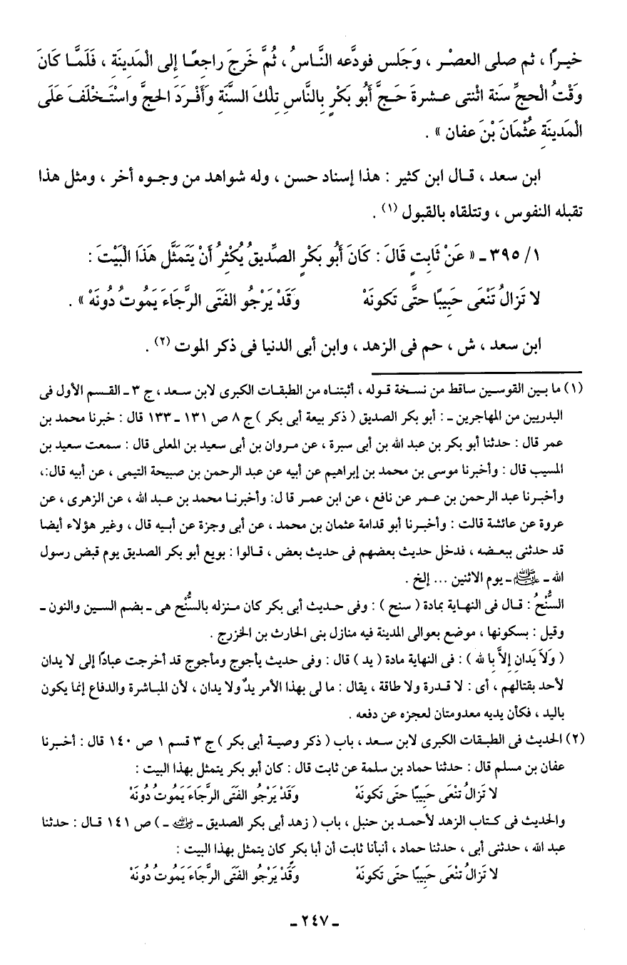 (¬2) الحديث في الطبقات الكبرى لابن سعد، باب (ذكر وصية أبى بكر) ج 3 قسم 1 ص 140 قال: أخبرنا عفان بن مسلم قال: حدثنا حماد بن سلمة عن ثابت قال: كان أبو بكر يتمثل بهذا البيت: