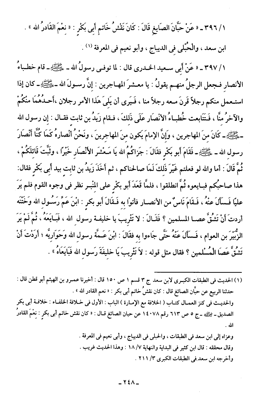 1/ 396 - "عَنْ حَبَّانَ الصَايغِ قَالَ: كَانَ نَقْشُ خَاتمِ أَبِى بَكْرٍ: "نِعْمَ القَادرُ الله".