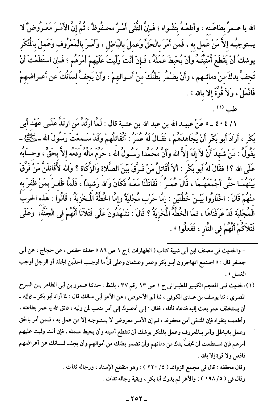 1/ 404 - "عَنْ عبيد الله بن عبد الله بن عتبة قال: لَمَّا ارْتَدَّ مَنِ ارتَدَّ عَلَى عَهْد أبِى بَكْرٍ، أَرَادَ أَبو بَكْرٍ أَنْ يُجَاهِدَهُمْ، فَقَالَ لَهُ عُمَرُ: أَتُقَاتِلُهمْ وَقَدْ سَمِعْتَ رَسُولَ الله - صلى الله عليه وسلم - يَقُولُ: مَنْ شَهِدَ أَنْ لَا إِلَهَ إِلَّا الله وَأَنَّ مُحَمَّدا رَسُولُ الله، حَرُمَ مَالُهُ وَدَمُه إِلَّا بحَقٍّ، وحِسَابُه عَلَى الله؟ ! فقَالَ لهُ أَبو بَكْرٍ: أَلَا أُقَاتِلُ مَنْ فَرَّقَ بَيْنَ الصَّلاةِ وَالزَّكَاة؟ وَالله لأُقَاتِلَنَّ مَنْ فَرَّقَ بَيْنَهُمَا حَتَّى أَجْمَعَهُمَا، قَالَ عُمَرُ: فَقَاتَلْنَا مَعَهُ فَكَانَ وَالله رَشِيدًا، فَلَمَّا ظفِرَ بِمَنْ ظَفِرَ بِه مِنْهُمْ قَالَ: اخْتَارُوا بَيْنَ خطَّتَيْنِ: إمَّا حَرْب مُجْليَةٌ وإِمَّا الخُطَّةُ المُخزِيَةُ، قَالُوَا: هَذِهِ الحَربُ الْمُجْلِيَة قَدْ عَرَفْنَاهَا، فمَا الْخُطَّةُ المُخْزِيَةُ؟ قَالَ: تَشْهَدُونَ عَلَى قَتْلاَنَا أنَّهُمْ فِى الْجَنَّةِ, وَعلَى قَتْلَاكُمْ أَنَّهُمْ فِى النَّارِ، فَفَعلُوا".