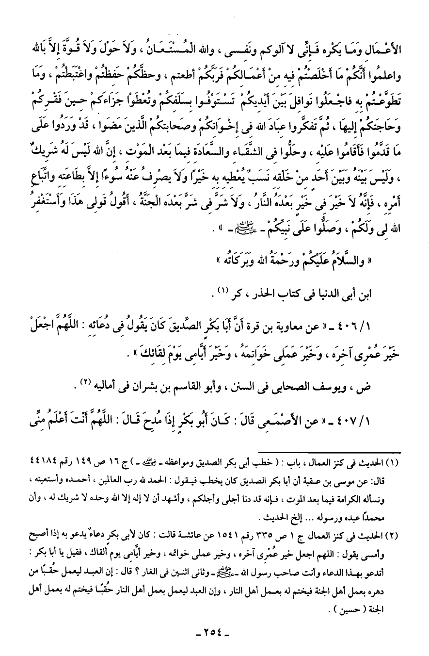 (¬2) الحديث في كنز العمال ج 1 ص 335 رقم 1541 عن عائشة قالت: كان لأبى بكرٍ دعاءٌ يدعو به إذا أصبح وأمسى يقول: اللهم اجعل خير عُمْرِى آخره، وخبر عملى خواتمه، وخير أيَّامِى يوم ألقاك، فقيل يا أبا بكر: أتدعو بهذا الدعاء وأنت صاحب رسول الله - صلى الله عليه وسلم - وثانى اثنين في الغار؟ قال: إن العبد ليعمل حُقبًا من دهره بعمل أهل الجنة فيختم له بعمل أهل النار، وإن العبد ليعمل بعمل أهل النار حُقبًا فيختم له بعمل أهل الجنة (حسين).