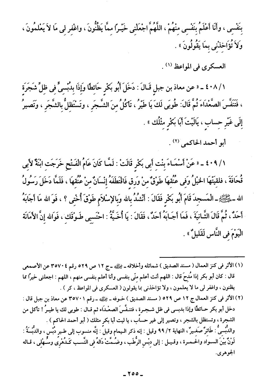 1/ 408 - "عن معاذ بن جبلٍ قَالَ: دَخَلَ أبُو بَكْرٍ حَائِطًا وَإِذَا بِدُبْسِىٍّ فِى ظِلِّ شَجَرَةٍ، فَتَنَفَّسَ الصَّعْدَاءَ ثمَّ قَالَ: طُوبَى لَكَ يَا طَيْرُ، تَأكُلُ مِنَ الشَّجَرِ، وتَسْتَظِلُّ بِالشَّجَرِ، وَتَصيرُ إِلَى غَيْرِ حِسابٍ، يَا لَيْتَ أبَا بَكْرٍ مِثْلُك".