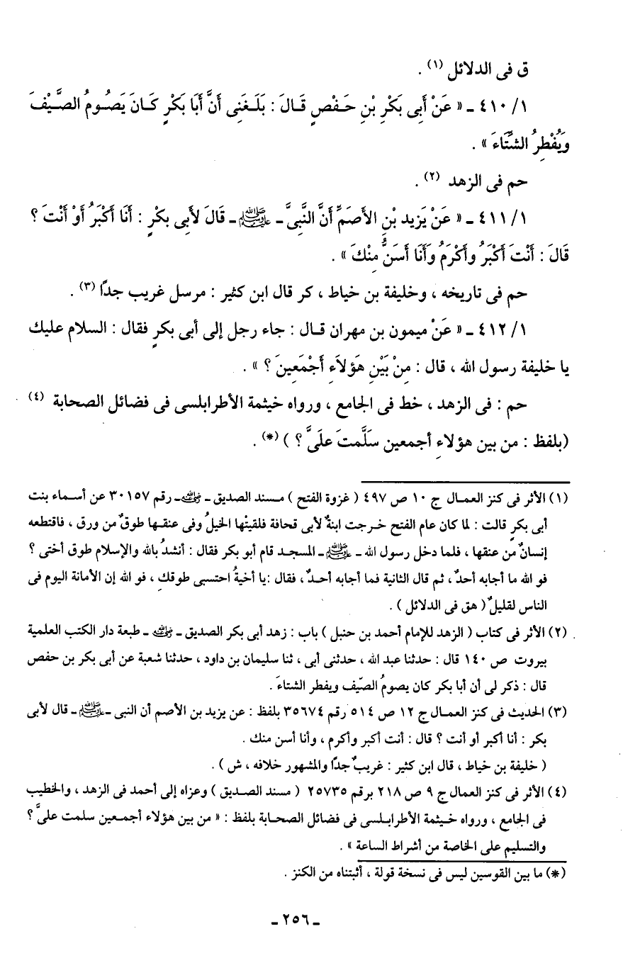1/ 411 - "عَنْ يَزيد بْنِ الأَصَمِّ أَنَّ النَّبِىَّ - صلى الله عليه وسلم - قَالَ لأَبِى بكْرٍ: أَنَا أَكْبَرُ أَوْ أَنْتَ؟ قَالَ: أَنْتَ أَكْبَرُ وأَكْرَمُ وَأَنَا أَسَنُّ مِنْكَ".