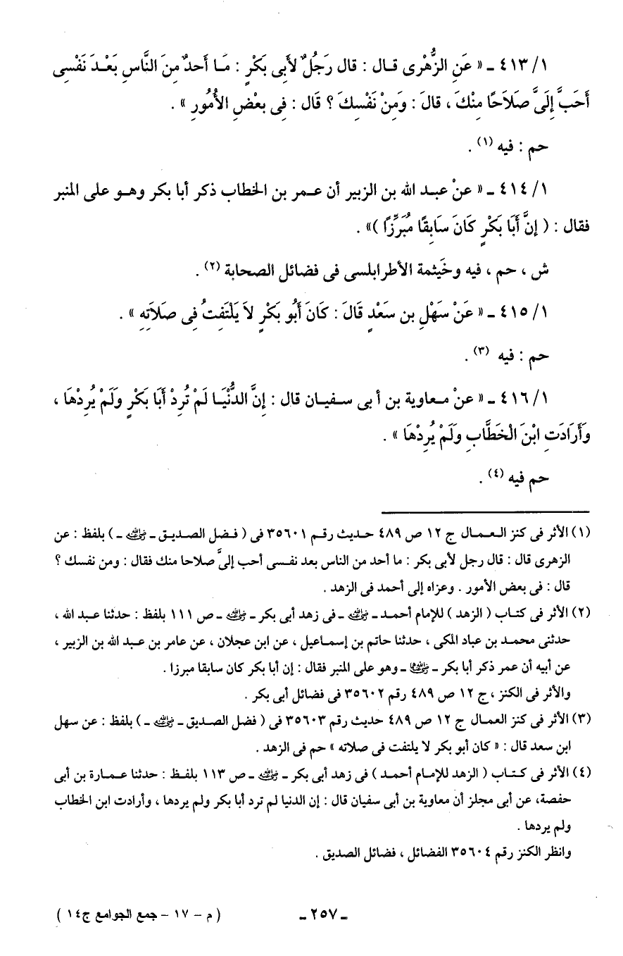 (¬3) الأثر في كنز العمال ج 12 ص 489 حديث رقم 35603 في (فضل الصديق - رضي الله عنه -) بلفظ: عن سهل بن سعد قال: "كان أبو بكر لا يلتفت في صلاته" حم في الزهد.
