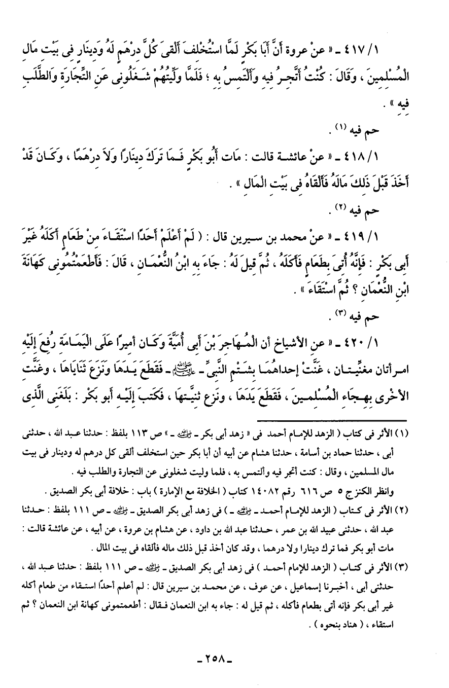 1/ 417 - "عنْ عروة أَنَّ أَبَا بَكْرٍ لَمَّا اسْتُخْلِفَ أَلْقىَ كُلَّ دِرْهَمٍ لَهُ وَدِينَارٍ فِى بَيْتِ مَالِ الْمُسْلِمِينَ، وَقَالَ: كُنْتُ أَتَّجِرُ فِيهِ وَأَلْتَمِسُ بِهِ؛ فَلَمَّا وَلِّيتُهُمْ شَغَلُونِى عَنِ التِّجَارَةِ وَالطَّلَبِ فِيهِ"