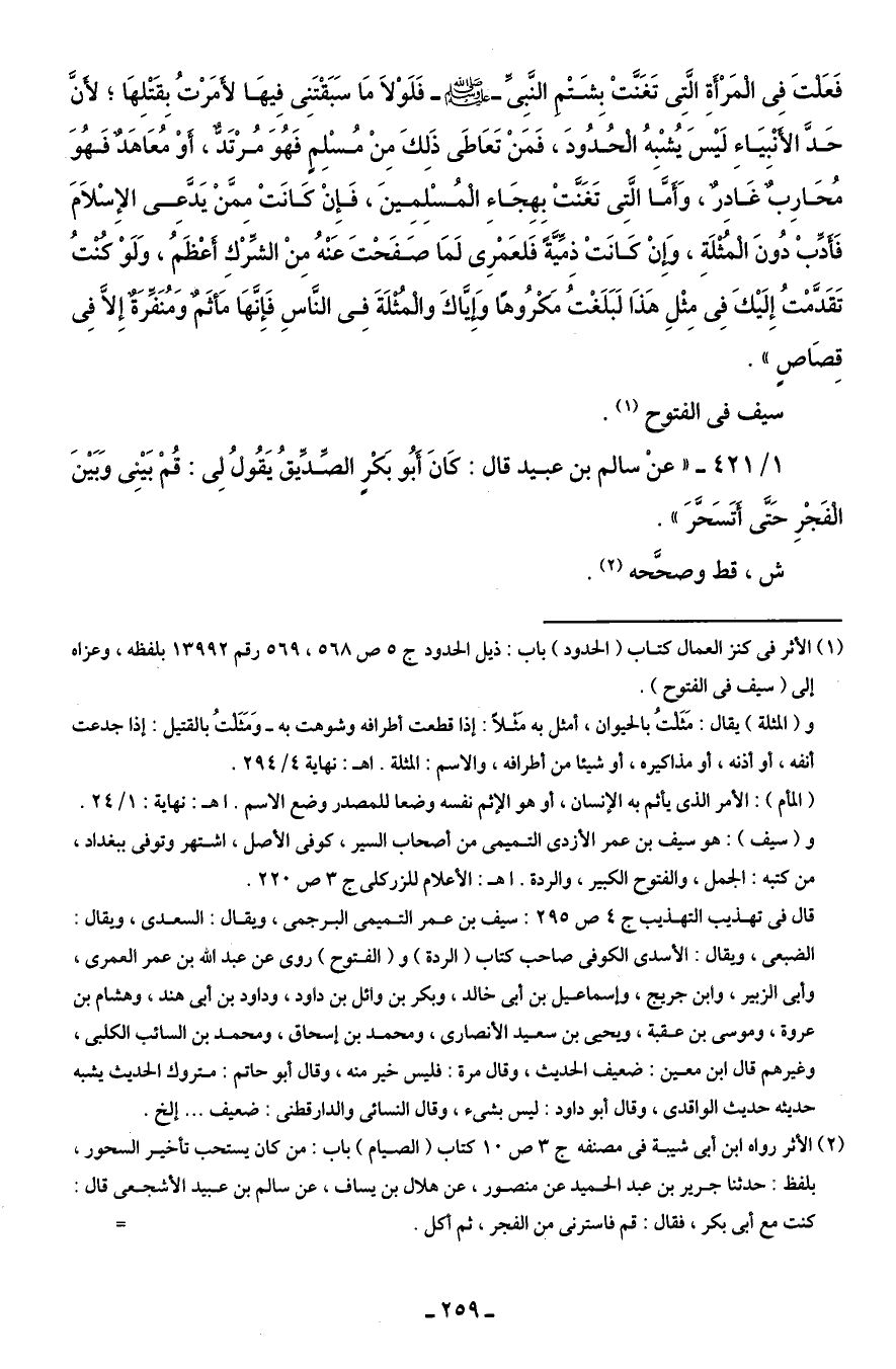 1/ 421 - "عنْ سالم بن عبيد قال: كَانَ أَبُو بَكْرٍ الصِّدِّيقُ يَقُولُ لِى: قُمْ بَيْنِى وَبَيْنَ الْفَجْرِ حَتَّى أَتَسَحَّرَ".