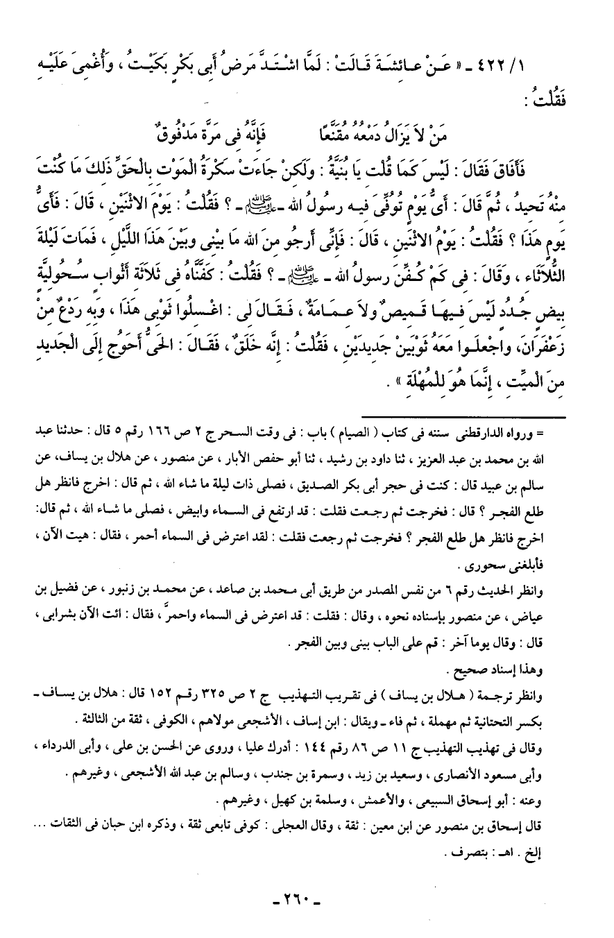 1/ 422 - "عَنْ عائِشَةَ قَالَتْ: لَمَّا اشْتَدَّ مَرضُ أَبِى بَكْرٍ بَكَيْتُ، وَأُغْمِىَ عَلَيْهِ فَقُلْتُ: