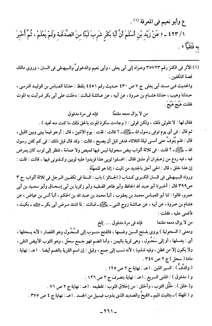 (¬1) الأثر في الكنز رقم 35723 وعزاه إلى أبى يعلى، وأبى نعيم والدغولىَّ والبيهقى في السنن، وروى مالك قصة التكفين.