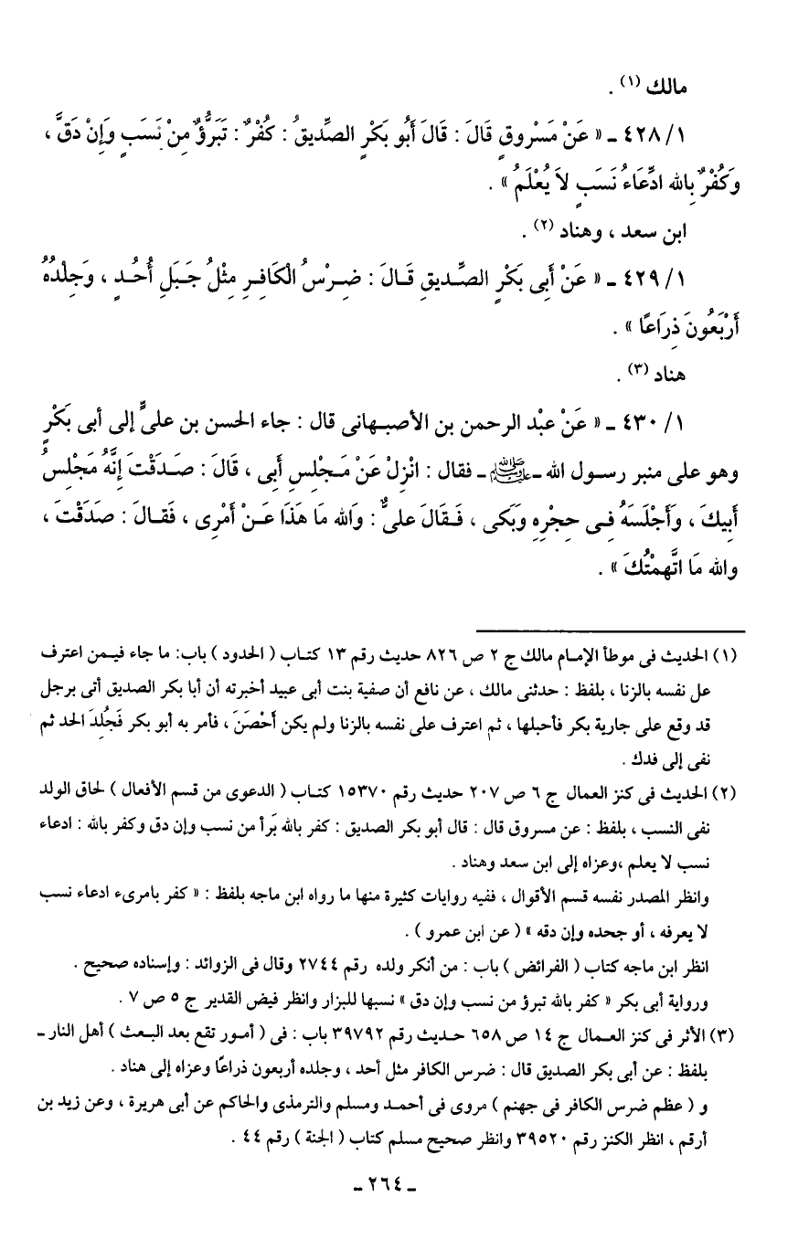 1/ 428 - "عَنْ مَسْروقٍ قَالَ: قَالَ أَبُو بَكرٍ الصِّديقُ: كُفْرٌ: تَبَرُّؤٌ مِنْ نَسَبٍ وَإِنْ دَقَّ، وَكُفْرٌ بِالله ادِّعَاءُ نَسَبٍ لَا يُعْلَمُ".