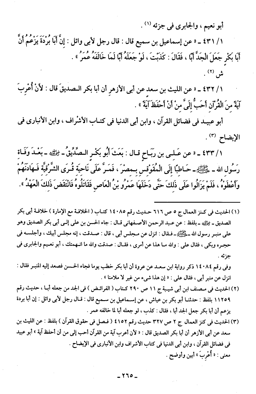 1/ 432 - "عن الليث بن سعدٍ عن أبى الأزهرِ أن أبا بكر الصديقَ قال: لأَنْ أُعْرِبَ آيَةً مِنَ الْقُرْآنِ أَحَبُّ إِلَىَّ مِنْ أنْ أَحْفَظَ آيَةً".