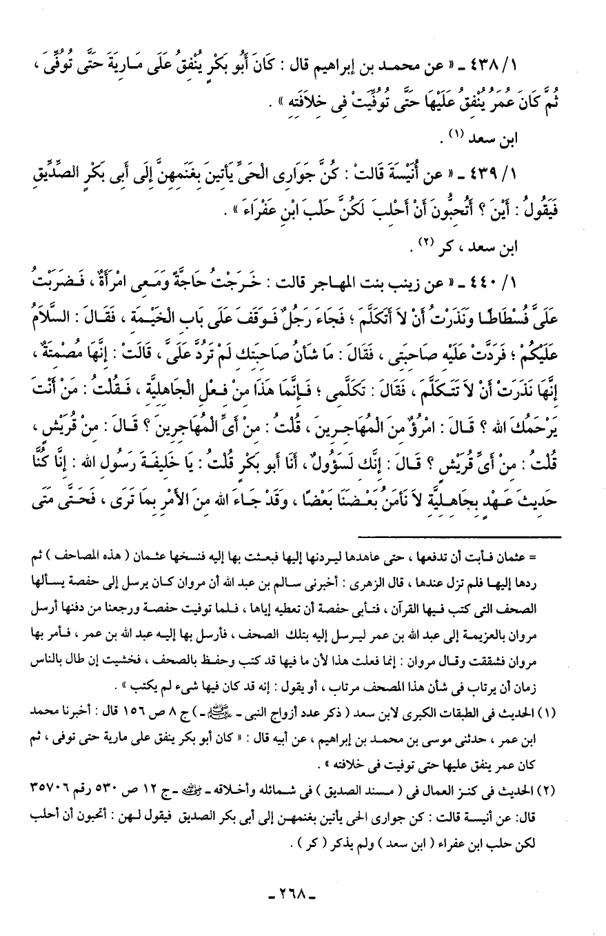 1/ 438 - "عن محمد بن إبراهيم قال: كَانَ أَبُو بَكْرٍ يُنْفِقُ عَلَى مَارِيَةَ حَتَّى تُوُفِّىَ، ثُمَّ كَانَ عُمَرُ يُنْفِقُ عَلَيْهَا حَتَّى تُوُفِّيَتْ فِى خِلَافَتِهِ".