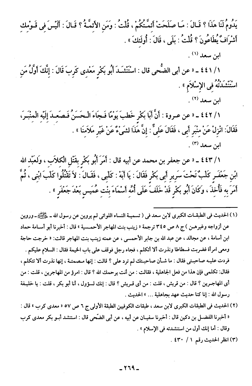 1/ 443 - "عن جعفر بن محمد عن أبيه قال: أَمَرَ أَبُو بَكْرٍ بِقَتْلِ الْكِلَابِ، وَلعَبْدِ الله بْنِ جَعْفَرٍ كَلْبٌ تَحْتَ سَرِيرِ أَبِى بَكْرٍ فَقَالَ: يَا أَبَهْ: كَلْبِى، فَقَالَ: لَا تَقْتُلُوا كَلْبَ ابْنِى، ثُمَّ أَمَرَ بِهِ فَأُخِذَ، وَكَانَ أَبُو بَكْرٍ قَدْ خَلَفَ عَلَى أُمِّهِ أَسْمَاءَ بِنْتِ عُمَيسٍ بَعْدَ جَعْفَرٍ".