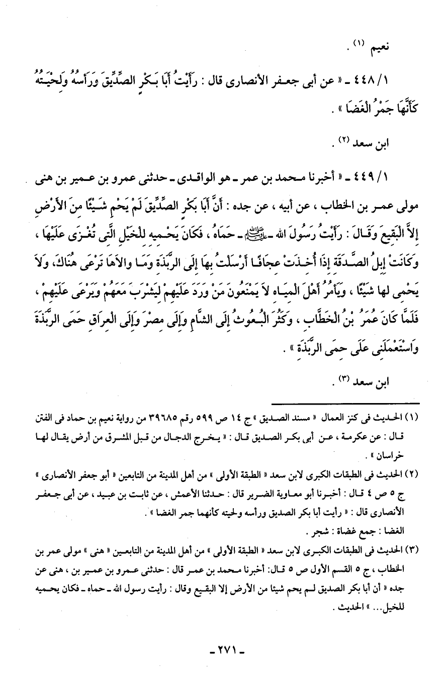 1/ 449 - "أخبرنا محمد بن عمر - هو الواقدى - حدثنى عمرو بن عمير بن هنى مولى عمر بن الخطاب، عن أبيه، عن جده: أَنَّ أبَا بَكْرٍ الصِّدَّيقَ لَمْ يَحْمِ شَيْئًا مِنَ الأَرْضِ إِلَّا الْبَقِيعَ وَقَالَ: رَأَيْتُ رَسُولَ الله - صلى الله عليه وسلم - حَمَاهُ، فَكَانَ يَحْمِيِهِ لِلْخَيْلِ الَّتِى تُغْزَى عَلَيْهَا، وَكَانَت إِبِلُ الصَّدَقَةِ إِذَا أُخِذَتْ عِجَافًا أَرْسَلْتُ بِهَا إِلَى الرَّبَذَةِ وَمَا والَاهَا تَرْعَى هُنَاكَ، وَلَا يَحْمِى لها شَيْئًا، وَيَأمُرُ أَهْلَ الْمِيَاهِ لَا يَمْنَعُونَ مَنْ وَرَدَ عَلَيْهِمْ لِيَشْرَبَ مَعَهُمْ وَيَرْعَى عَلَيْهِمْ، فَلَمَّا كَانَ عُمَرُ بْنُ الْخَطَّابِ، وَكَثُرَ الْبُعُوثُ إِلَى الشَّامِ وَإِلَى مِصْرَ وَإلَى الْعِرَاقِ حَمَى الرَّبَذَةَ وَاستَعْمَلَنِى عَلَى حِمَى الرَّبَذَةِ".