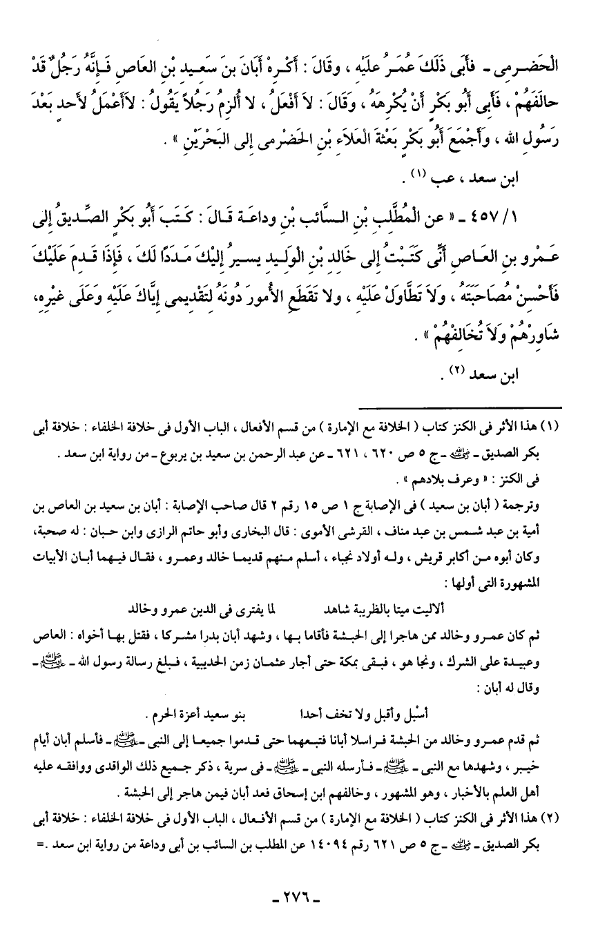 1/ 457 - "عن الْمُطَّلِبِ بْنِ السَّائب بْنِ وداعَة قَالَ: كَتَبَ أَبُو بَكْرٍ الصِّديقُ إِلى عَمْرو بنِ العَاصِ أَنِّى كَتَبْتُ إِلى خَالِدِ بْنِ الْوَلِيدِ يسيرُ إِليْكَ مَدَدًا لَكَ، فَإِذَا قَدِمَ عَلَيْكَ فَأَحْسِنْ مُصَاحَبَتَهُ، وَلاَ تَطَّاوَلْ عَلَيْهِ، ولا تَقَطَعِ الأُمورَ دُونَهُ لِتَقْدِيمى إِيَّاكَ عَلَيْهِ وَعَلَى غيْرِهِ، شَاوِرْهُمْ وَلَا تُخَالِفْهُمْ".