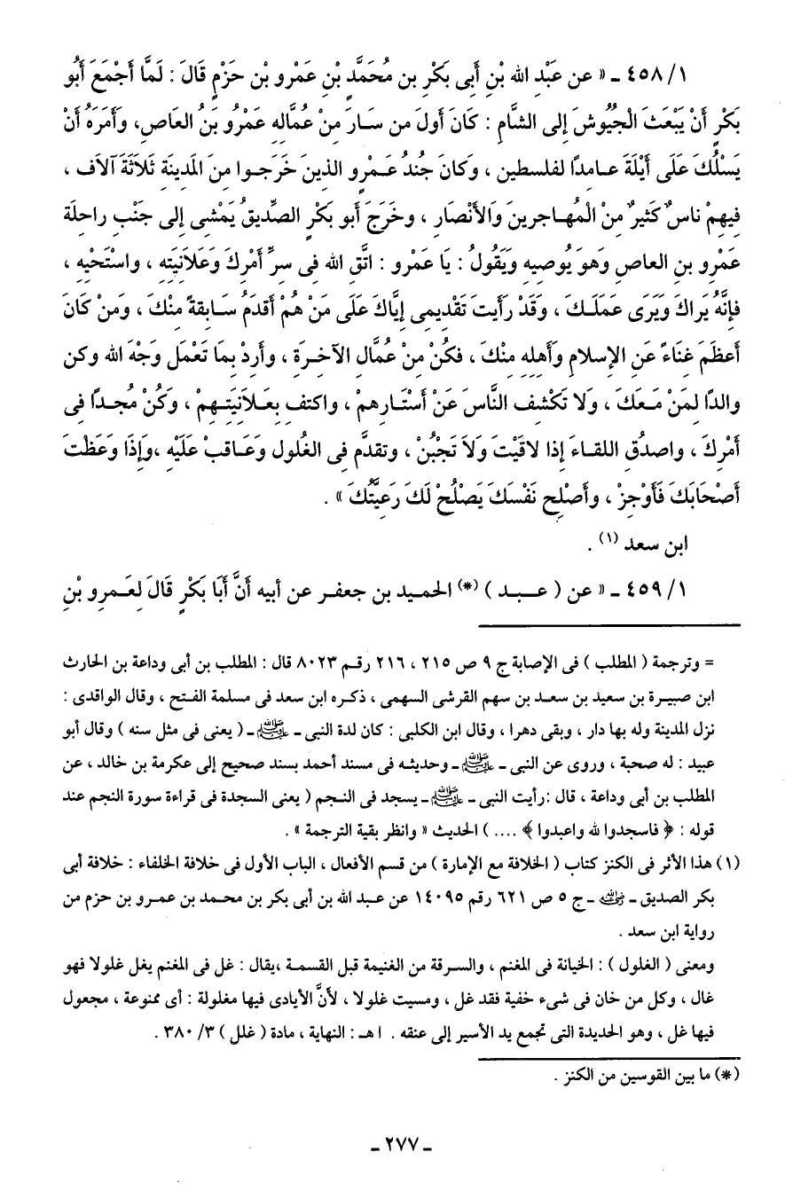 1/ 458 - "عن عَبْدِ الله بْنِ أَبِى بَكْرِ بن محَمَّدٍ بْنِ عَمْرو بْن حَزْمٍ قَالَ: لَمَّا أَجْمَعَ أَبُو بَكْرٍ أنْ يَبْعَثَ الْجُيُوشَ إِلى الشَّامِ: كَانَ أَولَ من سَارَ مِنْ عُمَّالِهِ عَمْرو بَنُ العَاصِ، وَأَمَرَهُ أَنْ يَسْلُكَ عَلَى أَيْلَةَ عامدًا لفلسطين، وَكانَ جُندُ عَمْرٍو الذِينَ خَرَجوا مِنَ المَدِينَةِ ثَلَاثَةَ آلَاف، فِيهِمْ ناسٌ كَثيرٌ مِنْ الْمُهاجرينَ وَالأَنْصَارِ، وخَرَجَ أَبو بَكْرٍ الصِّديقُ يَمْشِى إِلى جَنْبِ راحِلَة عَمْرِو بنِ العاصِ وَهوَ يُوصِيهِ وَيَقُولُ: يَا عَمْرو: اتَّقِ الله في سِرِّ أَمْرِكَ وَعَلَانِيَتِهِ، واسْتَحْيِهِ، فإِنَّهُ يَراكَ وَيَرَى عَمَلَكَ، وَقَدْ رَأَيتَ تَقْدِيمِى إِيَّاكَ عَلَى مَنْ هُمْ أَقدَمُ سَابِقةً مِنْكَ، وَمنْ كَانَ أَعظَمَ غِنَاءً عَنِ الإِسلامِ وَأَهِلِهِ مِنْكَ، فكُنْ مِنْ عُمَّالِ الآخِرَةِ، وأَرِدْ بِمَا تَعْمَل وَجْهَ الله وكن والدًا لِمَنْ مَعَكَ، وَلا تَكْشِف النَّاسَ عَنْ أَسْتَارِهمْ، واكتفِ بِعَلَانِيَتِهِمْ، وَكُنْ مُجدًا فِي أَمْرِكَ، واصدُقِ اللقاءَ إِذا لاقَيْتَ وَلَا تَجْبُنْ، وتقدَّم فِي الغُلول وَعَاقبْ عَلَيْهِ، وَإِذَا وَعَظْتَ أَصْحَابَكَ فَأَوْجِزْ، وأَصْلِح نَفْسَكَ يَصْلُحْ لَكَ رَعِيَّتُكَ".