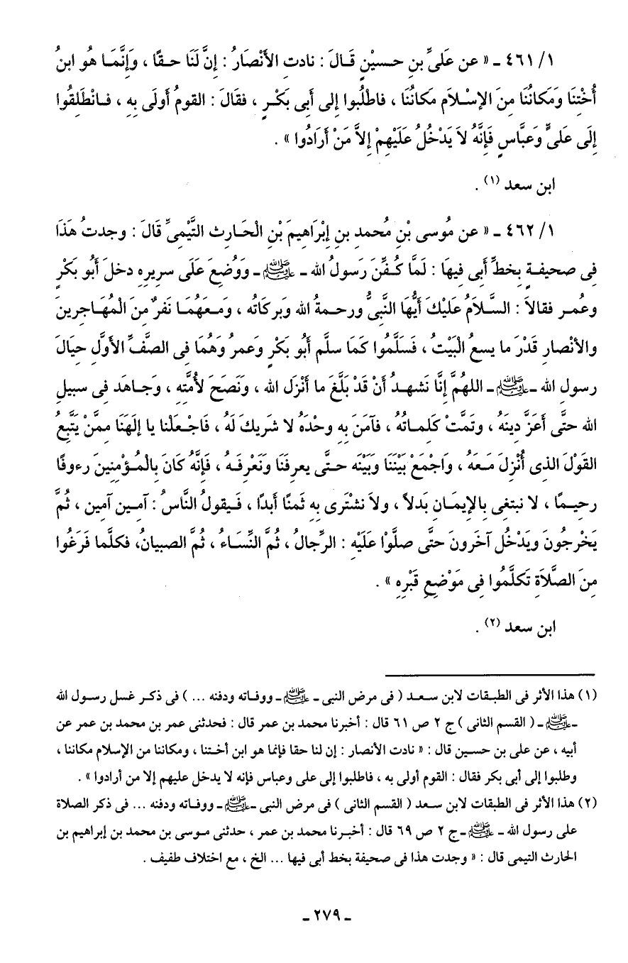 (¬1) هذا الأثر في الطبقات لابن سعد (في مرض النبي - صلى الله عليه وسلم - ووفاته ودفنه ... ) في ذكر غسل رسول الله - صلى الله عليه وسلم - (القسم الثانى) ج 2 ص 61 قال: أخبرنا محمد بن عمر قال: فحدثنى عمر بن محمد بن عمر عن أبيه، عن على بن حسين قال: "نادت الأنصار: إن لنا حقا فإنما هو ابن أختنا، ومكاننا من الإسلام مكاننا، وطلبوا إلى أبي بكر فقال: القوم أولى به، فاطلبوا إلى على وعباس فإنه لا يدخل عليهم إلا من أرادوا".