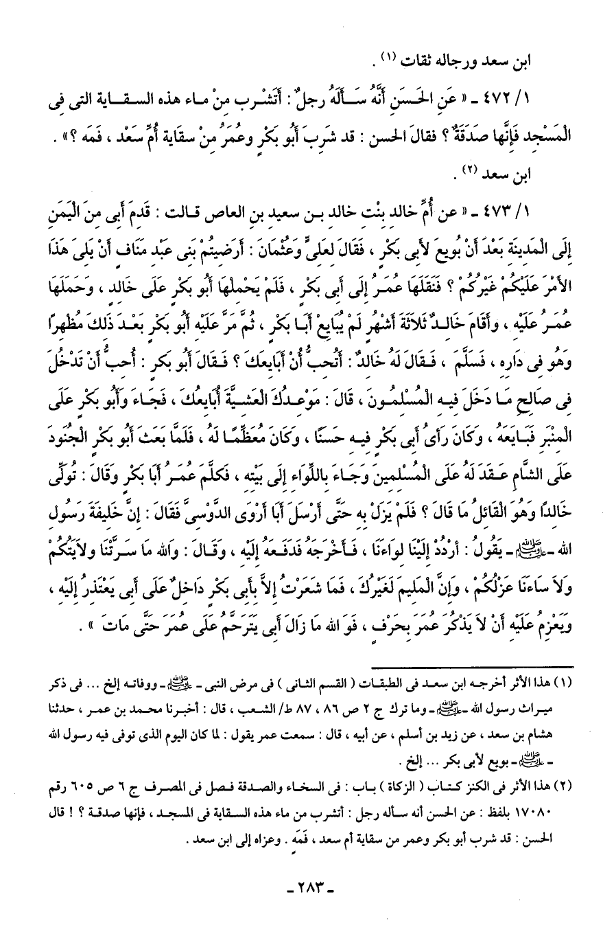 (¬2) هذا الأثر في الكنز كتاب (الزكاة) باب: في السخاء والصدقة فصل في المصرف ج 6 ص 605 رقم 17080 بلفظ: عن الحسن أنه سأله رجل: أتشرب من ماء هذه السقاية في المسجد، فإنها صدقة؟ ! قال الحسن: قد شرب أبو بكر وعمر من سقاية أم سعد، فَمَهٍ. وعزاه إلى ابن سعد.