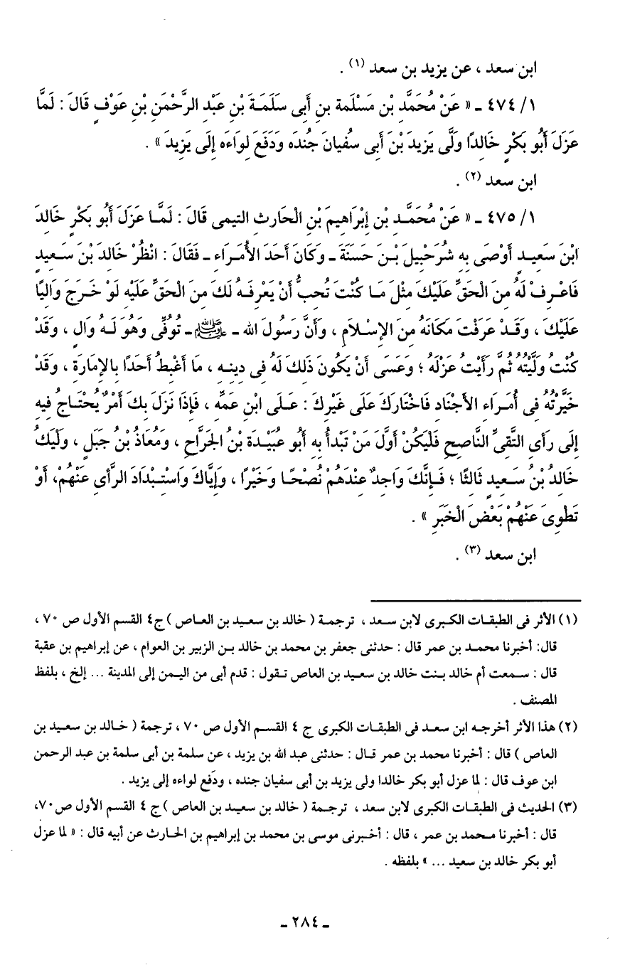 1/ 474 - "عَنْ مُحَمَّدِ بْن مَسْلَمة بنِ أَبِى سَلَمَةَ بْنِ عَبْدِ الرَّحْمَنِ بْنِ عَوْفٍ قَالَ: لَمَّا عَزَلَ أَبُو بَكْرٍ خَالِدًا وَلَّى يَزيدَ بْنَ أَبِى سُفيانَ جُندَه وَدَفَعَ لِوَاءَه إِلَى يَزِيدَ".
