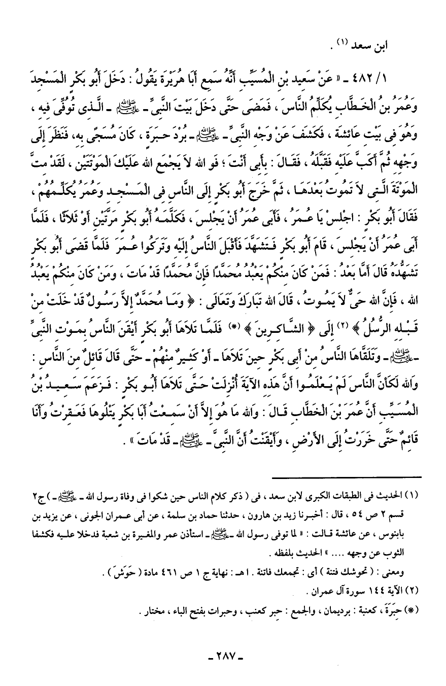 1/ 482 - "عَنْ سَعِيد بْنِ الْمُسَيِّبِ أَنِّهُ سَمِع أَبَا هُرَيْرَة يَقُولُ: دَخَلَ أَبُو بَكْرٍ الْمَسْجِدَ وَعُمَرُ بنُ الْخَطَّابِ يُكَلِّمُ النَّاسَ، فَمَضَى حَتَّى دَخَلَ بَيْتَ النَّبِىِّ - صلى الله عليه وسلم - الَّذِى تُوُفِّىَ فِيهِ، وَهُوَ في بَيْتِ عَائِشَة، فَكَشَفَ عَنْ وَجْهِ النَّبِىِّ - صلى الله عليه وسلم - بُرْدَ حبَرَةٍ، كَانَ مُسَجًى بِهِ، فَنَظَرَ إِلَى وَجْهِهِ ثُمَّ أَكَبَّ عَلَيْهِ فَقَبَّلَهُ، فَقَالَ: بِأَبِى أَنْتَ؛ فَوالله لَا يَجْمَع الله عَلَيْكَ الْمَوْتَتَيْن، لَقَدْ مِتَّ الْمَوْتَةَ الَّتِى لَا تَمُوتُ بَعْدَهَا، ثَمَّ خَرَجَ أَبُو بَكْرٍ إِلَى النَّاسِ في الْمَسْجِد وَعُمَرُ يُكَلِّمُهُمْ، فَقَالَ أَبُو بَكْرٍ: اجْلِسْ يَا عُمَرُ، فَأَبَى عُمَرُ أَنْ يَجْلسَ، فَكَلَّمَهُ أَبُو بَكْرٍ مَرَّتَيْنِ أَوْ ثَلاَثًا، فَلَمَّا أَبَى عُمَرُ أَنْ يَجْلِسَ، قَامَ أَبُو بَكْرٍ فَتَشَهَّدَ فَأَقْبَلَ الَنَّاسُ إِلَيْه وَتَرَكُوا عُمَرَ فَلَمَّا قَضَى أَبُو بَكْرٍ تَشَهُّدَهُ قَالَ أَمَّا بَعْدُ: فَمَنْ كَانَ مِنْكُمْ يَعْبُدُ مُحَمَّدًا فَإِنَ مُحَمَّدًا قَدْ مَاتَ، وَمَنْ كَانَ مِنْكُمْ يَعْبُدُ الله، فَإِنَّ الله حَىٌّ لَا يَمُوتُ، قَالَ الله تَبَارَكَ وَتَعَالَى: {وَمَا مُحَمَّدٌ إِلَّا رَسُولٌ قَدْ خَلَتْ مِنْ قَبْلِهِ الرُّسُلُ} (¬2) إِلَى {الشَّاكِرِينَ} (*) فَلَمَّا تَلَاهَا أَبُو بَكْرٍ أَيْقَنَ النَّاسُ بمَوْت النَّبِىِّ - صلى الله عليه وسلم - وَتَلَقَّاهَا النَّاسُ مِنْ أَبِى بَكْرٍ حِينَ تَلَاهَا - أَوْ كَثِيرٌ مِنْهُمْ - حَتَّى قَالَ قَائِلٌ مِنَ النَّاسِ: وَالله لَكَأنَّ النَّاسَ لَمْ يَعْلَمُوا أَنَّ هَذِهِ الآيَةَ أُنْزِلَتْ حَتَّى تَلَاهَا أَبُو بَكْرٍ: فَزَعَمَ سَعِيدُ بْنُ الْمُسَيِّبِ أَنَّ عُمَرَ بْنَ الْخَطَّابِ قَالَ: وَالله مَا هُوَ إِلَّا أَنْ سَمِعْتُ أَبَا بَكْرٍ يَتْلُوهَا فَعَقِرْتُ وَأَنَا قَائِمٌ حَتَّى خَرَرْتُ إِلَى الأَرْضِ، وَأَيْقَنْتُ أَنَّ النَّبِىَّ - صلى الله عليه وسلم - قَدْ مَاتَ".